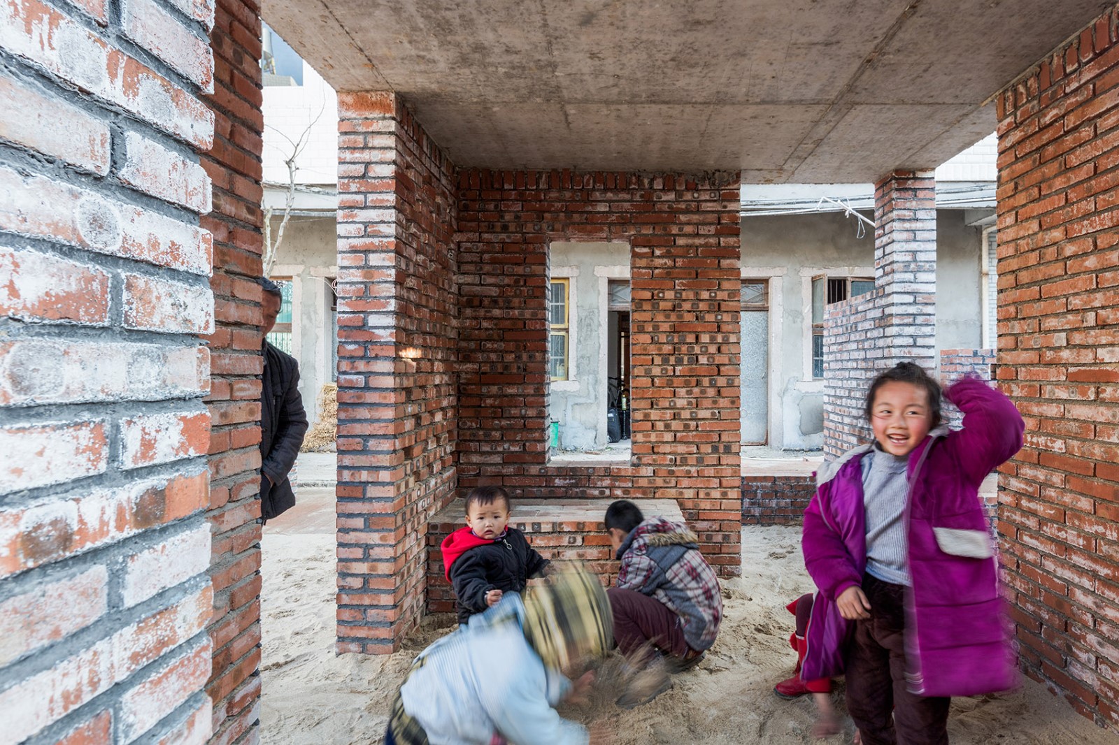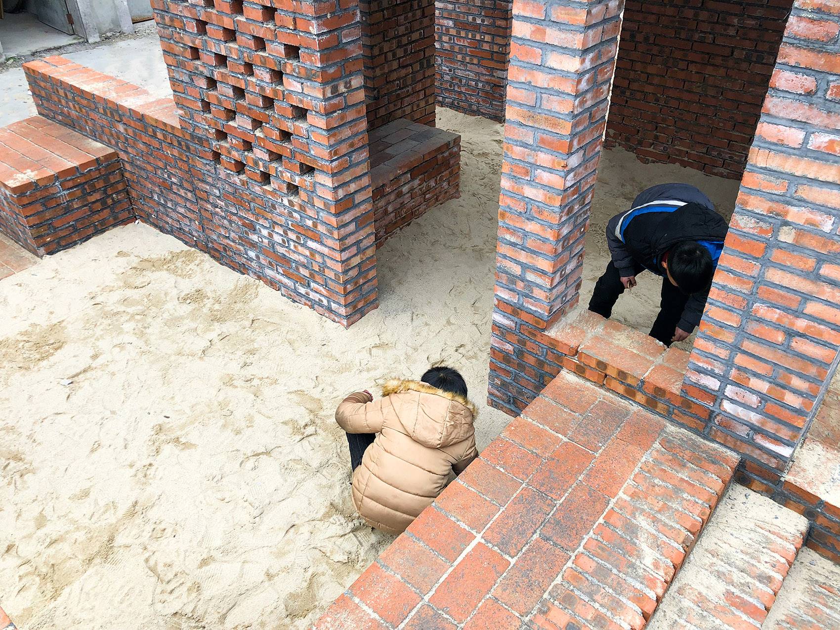 沙地似乎對于小孩有一種特殊的魔力,它本身只是一種普通的材料,可經(jīng)過這些孩童之手,它變成了無限的可能。我們希望小孩們更多的去探索真實的世界,而不再是只在虛擬世界游戲。因此置入了與“地”親觸的沙地活動空間。成人與小孩之間若即若離的關(guān)系同時也在紅磚與沙兩種材料的阻隔與進(jìn)入關(guān)系中體現(xiàn)出來。