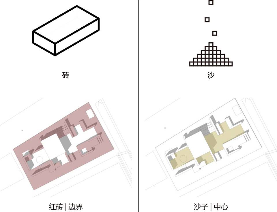 材料的選擇與我們的理念想法相符,我們用極硬的紅磚與極軟的沙子作為兩種主要材料,表達(dá)出來的材料感受與自我內(nèi)心的兩端相呼應(yīng)。紅磚意為秩序、靜止與不變,沙地意為欲望、流動與萬變。以極硬與極軟產(chǎn)生強(qiáng)烈的反差。沙子的自由與小孩的天性是一種本我狀態(tài):沖動與天性、欲望與釋放;紅磚的秩序與成人的束縛是一種超我狀態(tài):秩序與守則、約束與抑制。這是一場本我與超我的談判,一個自我的形成。