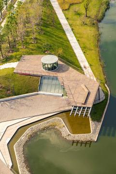 濱水廣場為周邊居民提供豐富的活動場地:設(shè)計中將地形抬高,將咖啡廳嵌入并地形之中,濱水活力的旱噴水景及從廊架跌落的水景,使兒童可以近距離的在水中嬉戲。