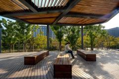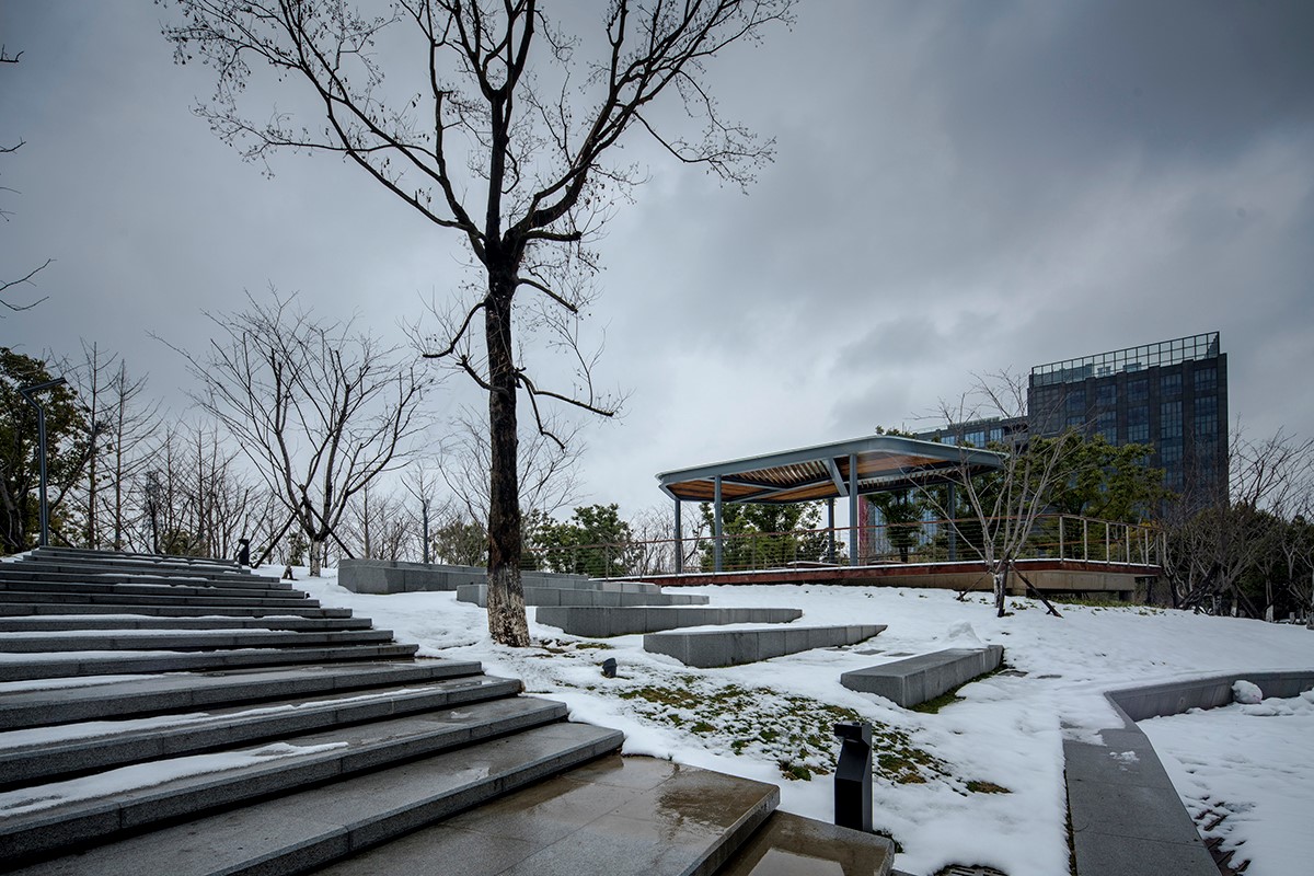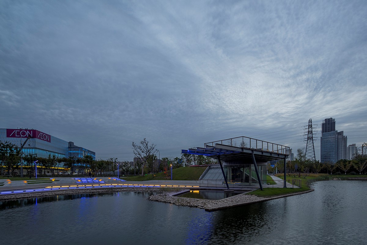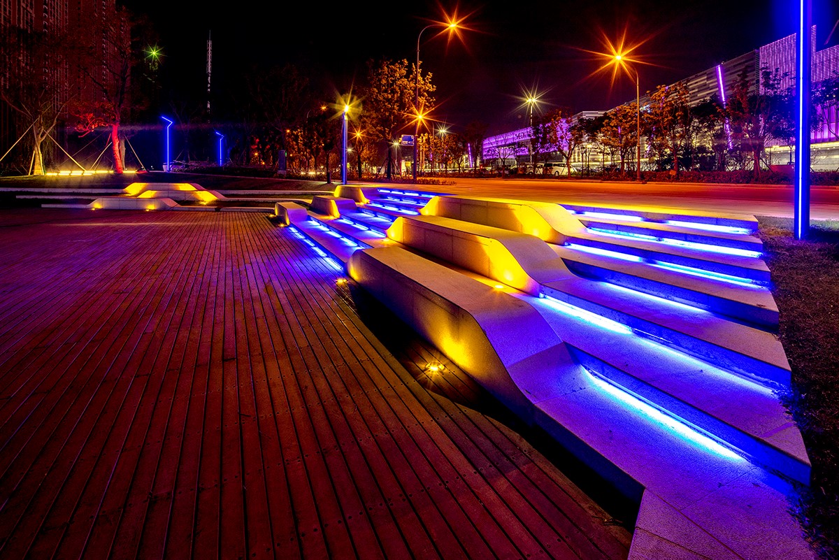 通過推拉懸浮三維的設(shè)計手法,縱向延展空間,從而形成低處的親水聚集平臺、高處的觀景休憩平臺等空間,為周邊的辦公人群提供休閑、交流以及洽談空間。