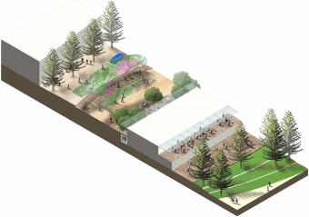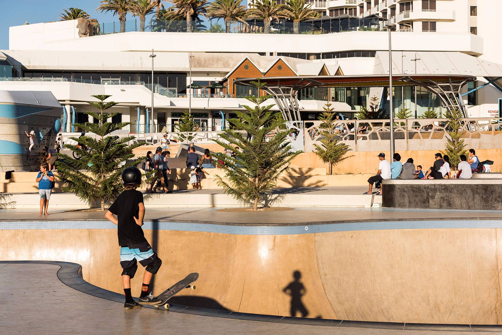 在臨海前灘的設(shè)計上,建筑師引入了兩條主要的步行長廊,不僅創(chuàng)造出更好的交通流線空間,更為人們提供了一系列休閑娛樂的新機(jī)會。上部的長廊與零售店小賣鋪、餐飲中心、城市廣場和一系列新開發(fā)區(qū)相連,下部的長廊則為市民們提供了一系列運動空間如慢跑道、自行車道和其他有著積極用途的活動空間等。項目的核心是一個名為The Snake Pit的世界級滑冰和抱石運動空間,該空間由建筑師與景觀設(shè)計事務(wù)所Enlocus合作完成,其中包括一個3.6米寬的競賽級滑板滑道空間,以供當(dāng)?shù)鼗顒雍蛧H性比賽使用。