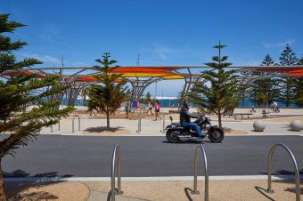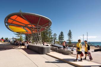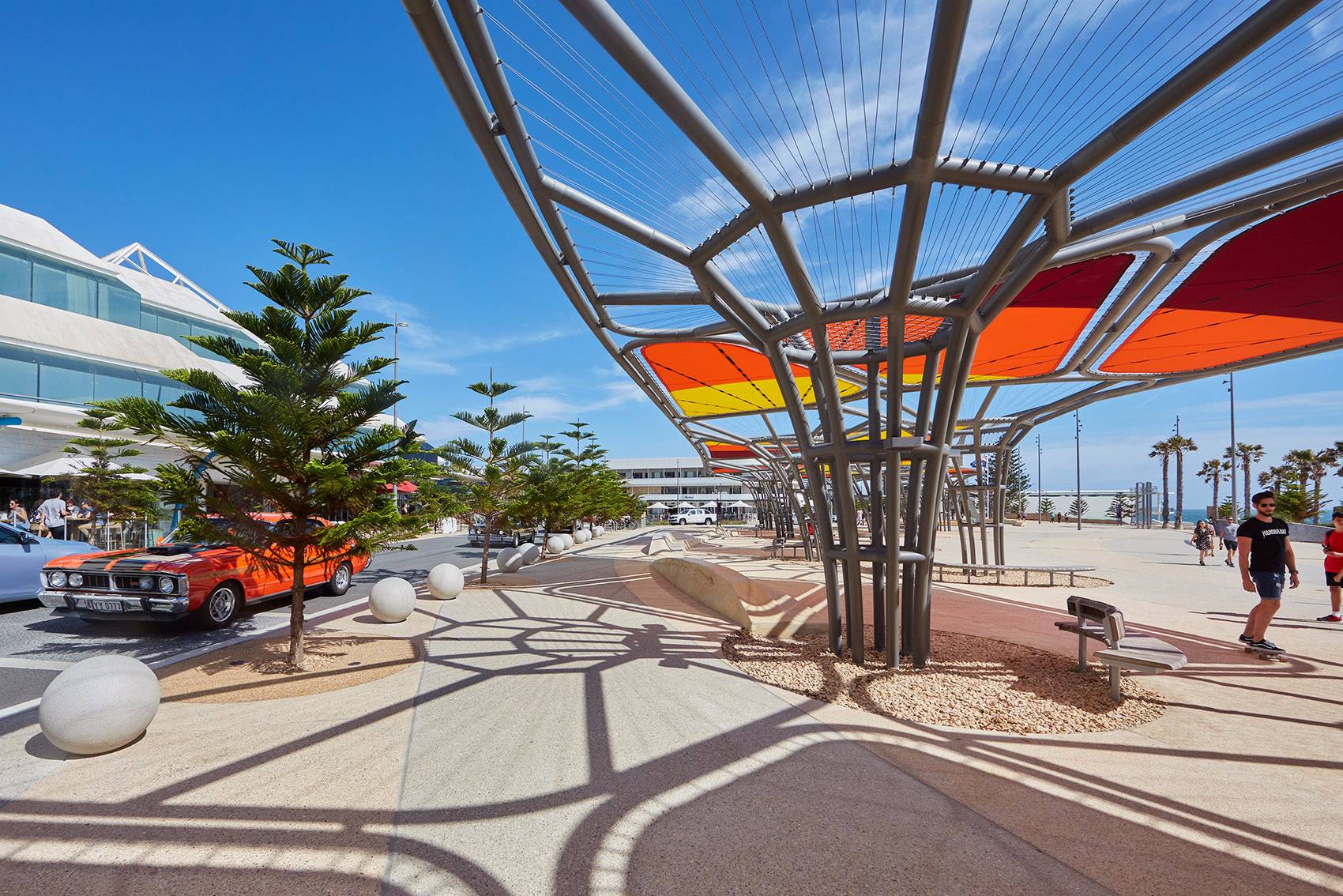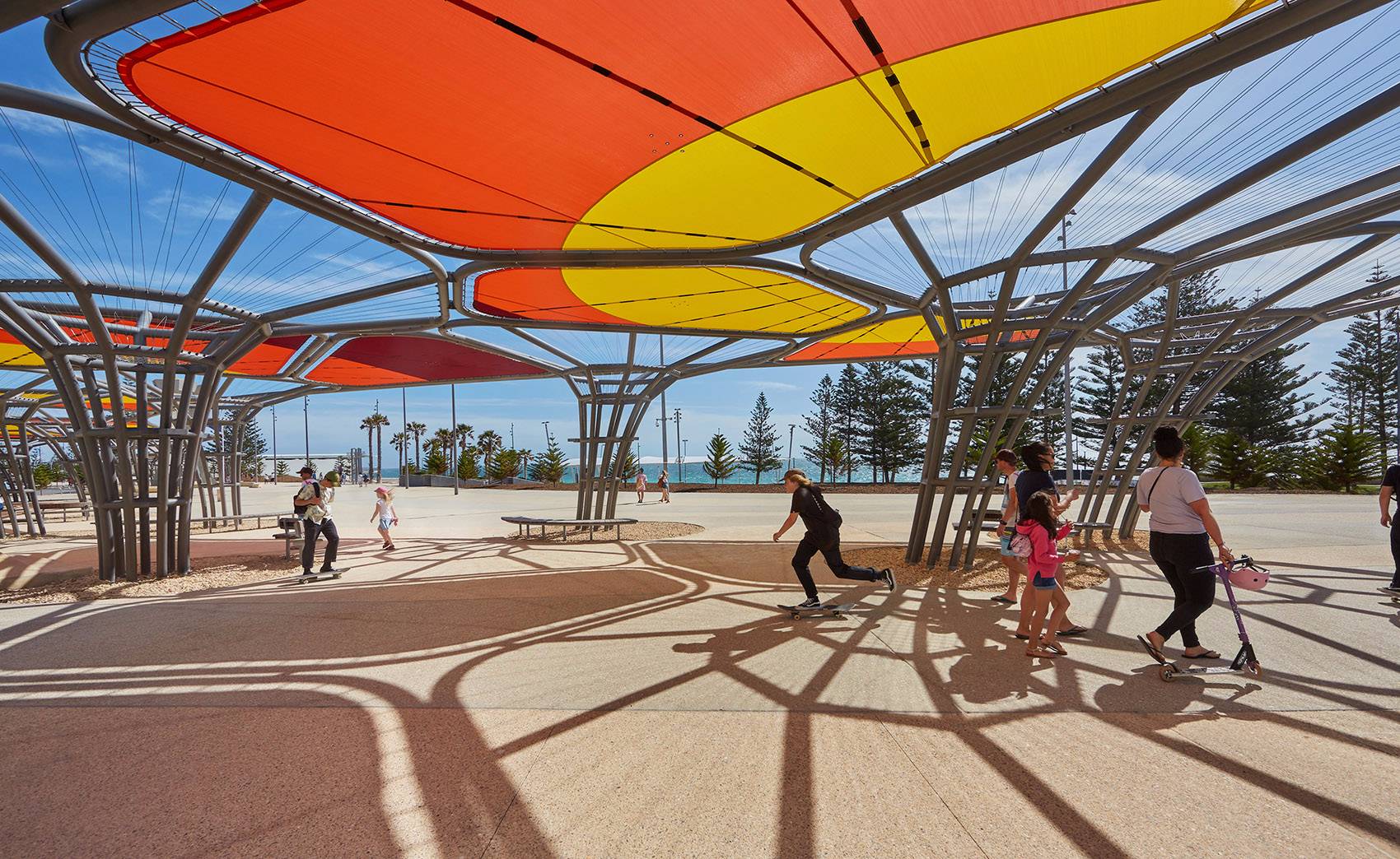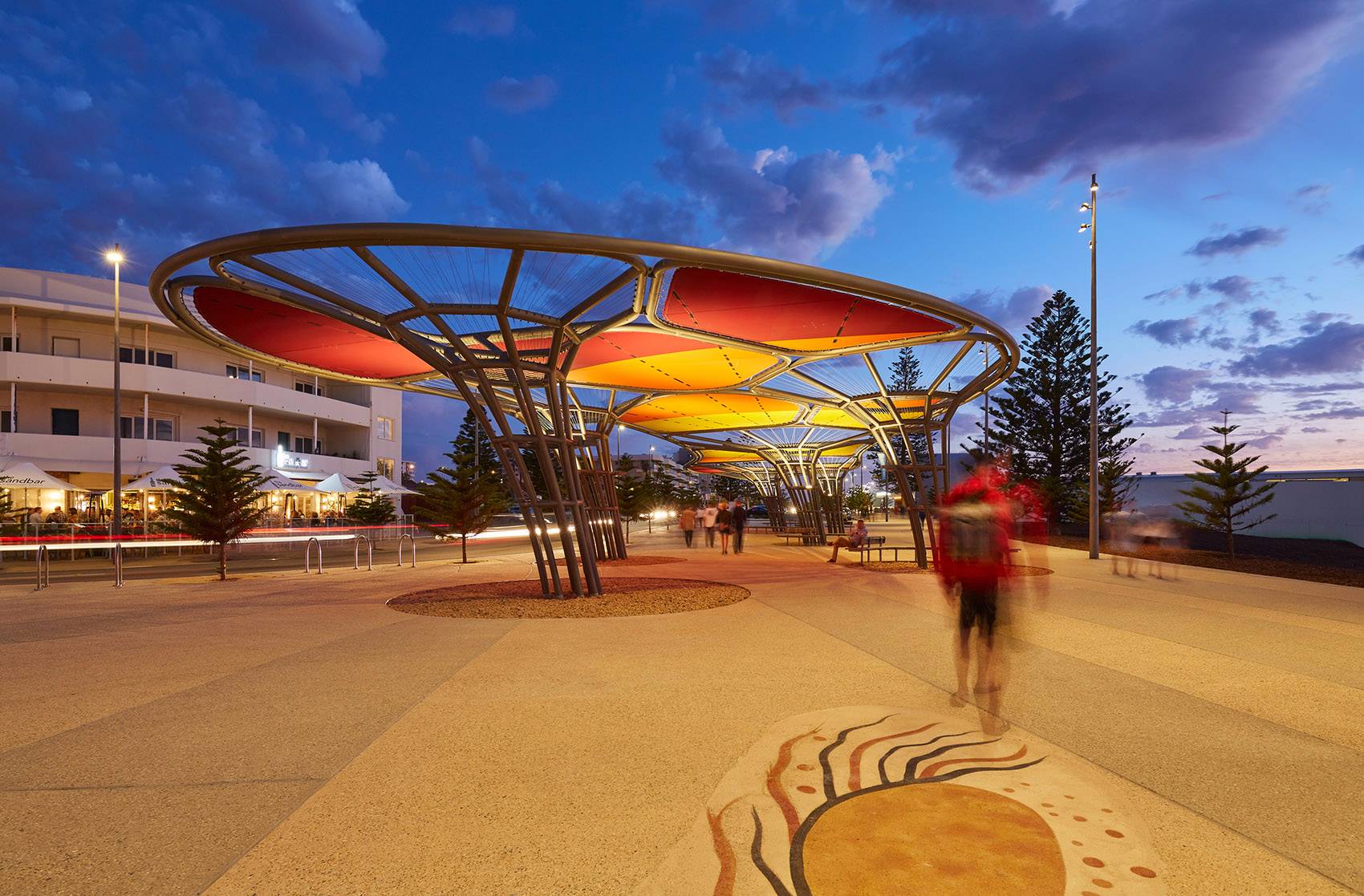 Scarborough廣場是一個全新的城市空間,位于海灘和The Esplanade步行區(qū)之間。該廣場是前灘的主要入口,其中還設(shè)有一套由Taylor Robinson Chaney Broderick設(shè)計的一套標(biāo)志性遮陽棚。該遮陽棚由設(shè)計團(tuán)隊與當(dāng)?shù)氐脑∶袼囆g(shù)家Sharyn Egan共同完成,其設(shè)計靈感來源于自然系統(tǒng)和幾何形狀中的“泰森多邊形(voronoi)”結(jié)構(gòu)。