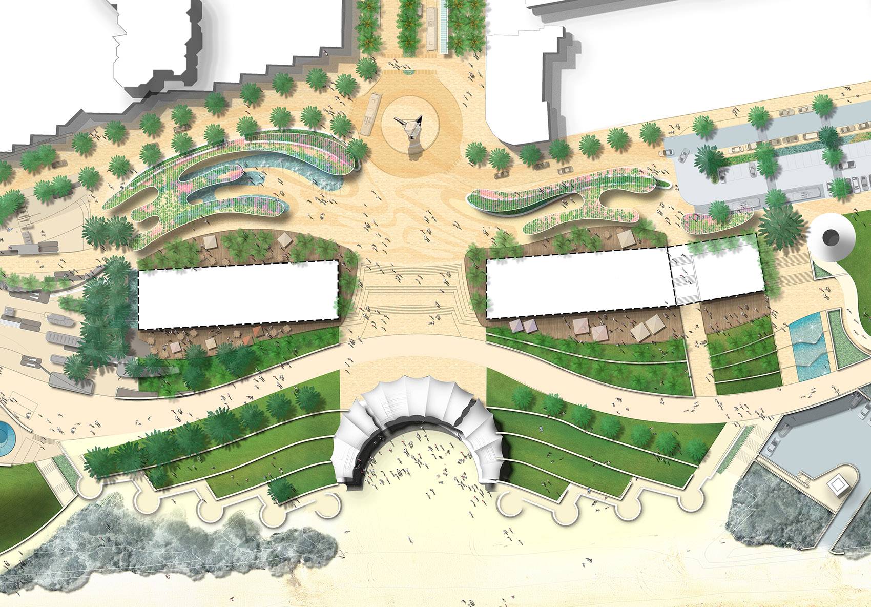 ▼海灘鳥瞰圖,一個以行人為中心的充滿活力的的城市海灘,
