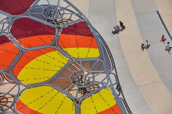 ▼Scarborough廣場上的遮陽棚近景外觀,其設(shè)計靈感來源于自然系統(tǒng)和幾何形狀中的“泰森多邊形”結(jié)構(gòu)
