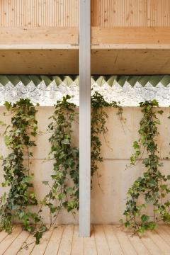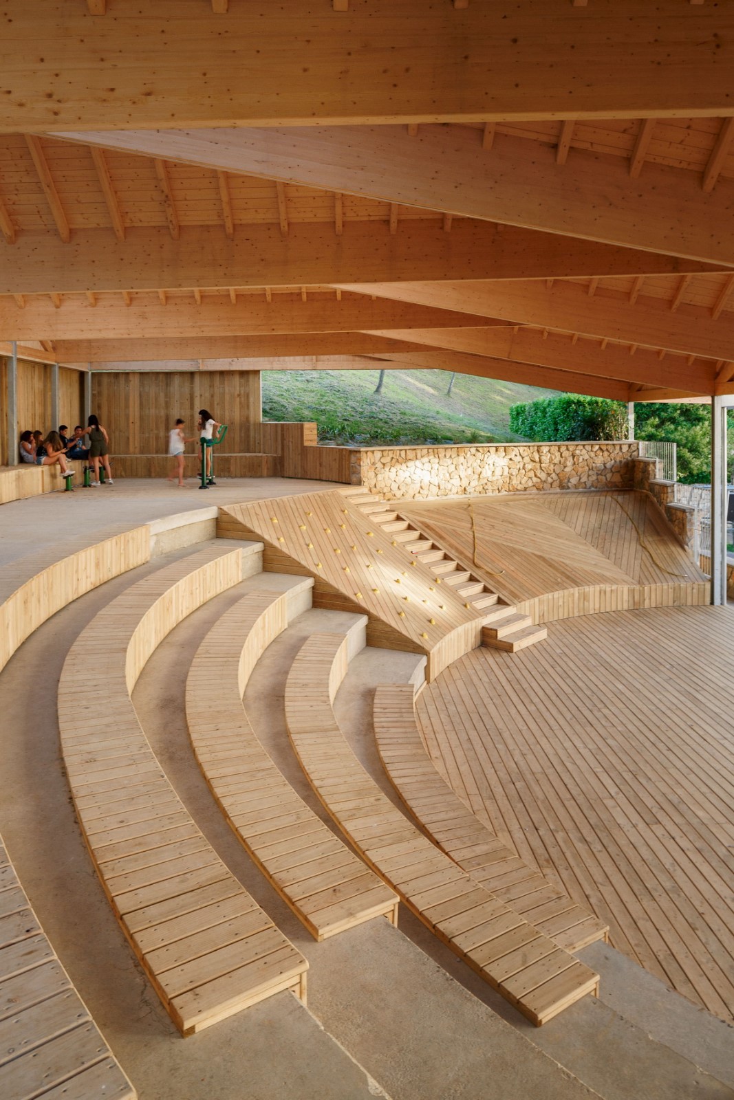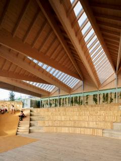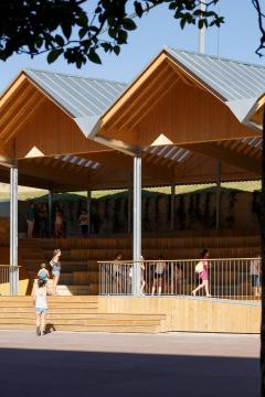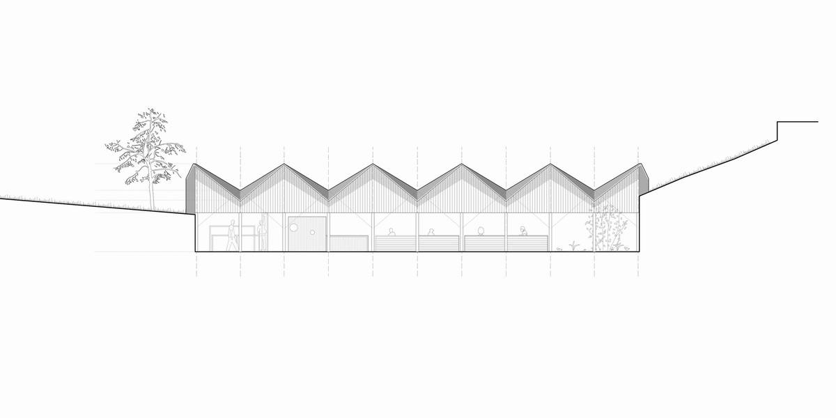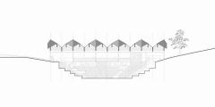 新的休閑區(qū)域布置遵循空間順序。通過設(shè)置不同但又相互聯(lián)系的空間,可以增加舊禮堂的用途。基于此種考慮,上部區(qū)域布置了康體設(shè)施,適宜老年居民活動。露天看臺則有雙重功能:提高了座位的舒適性,也方便觀看公眾演出的觀眾照看嬰兒。