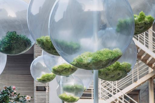 庭院上空,漂浮著裝有斑斕樹葉的氣球容器,斑駁的樹影柔和灑落?;ú葜脖粎⒉钣诟鱾€模塊之間,生長、綻放,將寬闊開廣的平臺裝點成引人入勝的花園。
