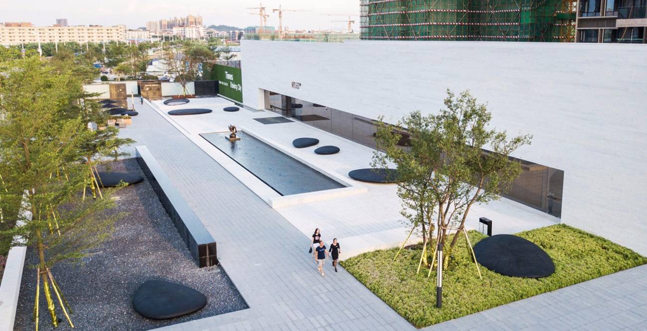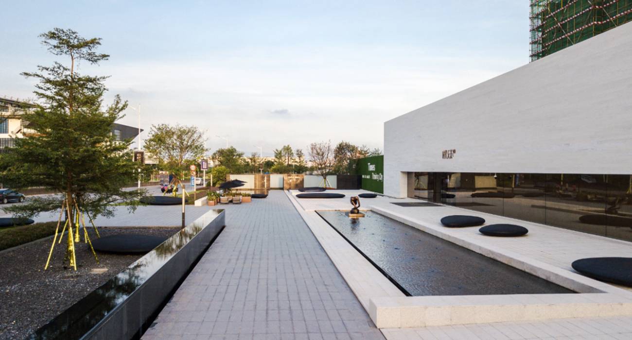 營銷中心前廣場作為建筑、室內(nèi)空間向景觀的延伸、用統(tǒng)一的材料來勾勒線條與體塊,行走中感受陽光下明暗與光影的變化,舒朗通透。