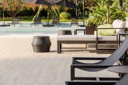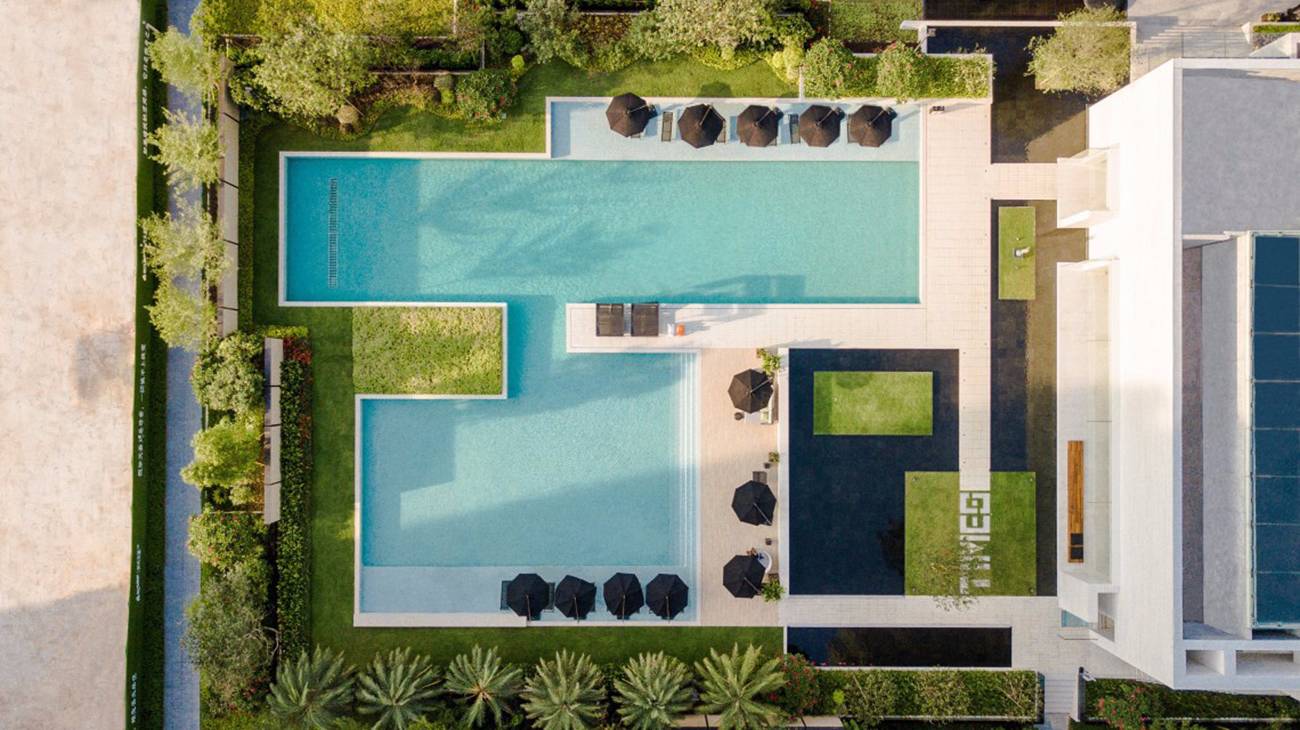 泳池區(qū)域為一脈相承的白色材質(zhì)表達(dá),會所交匯連接庭院和泳池區(qū),動與靜,使體驗動線極具靈動和趣味性,豐富而純粹,碰撞出耐人尋味的空間體驗感。