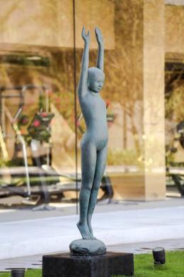 “日照小河戲水影”作品表現(xiàn)站在卵石上欲躍入水里的清新小女孩,飄逸的發(fā)絲、垂睫抿嘴微笑,體現(xiàn)一種靜謐境界,此雕塑限量8件,編號為3/8。第一件作品于 2011年永久安放于美國堪薩斯城。
