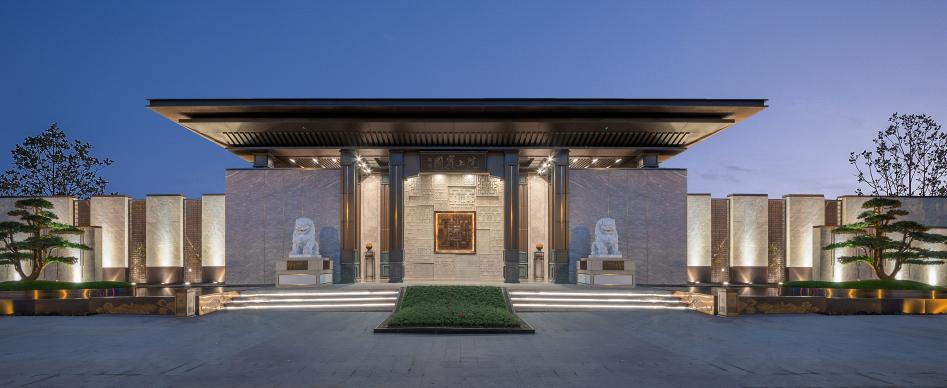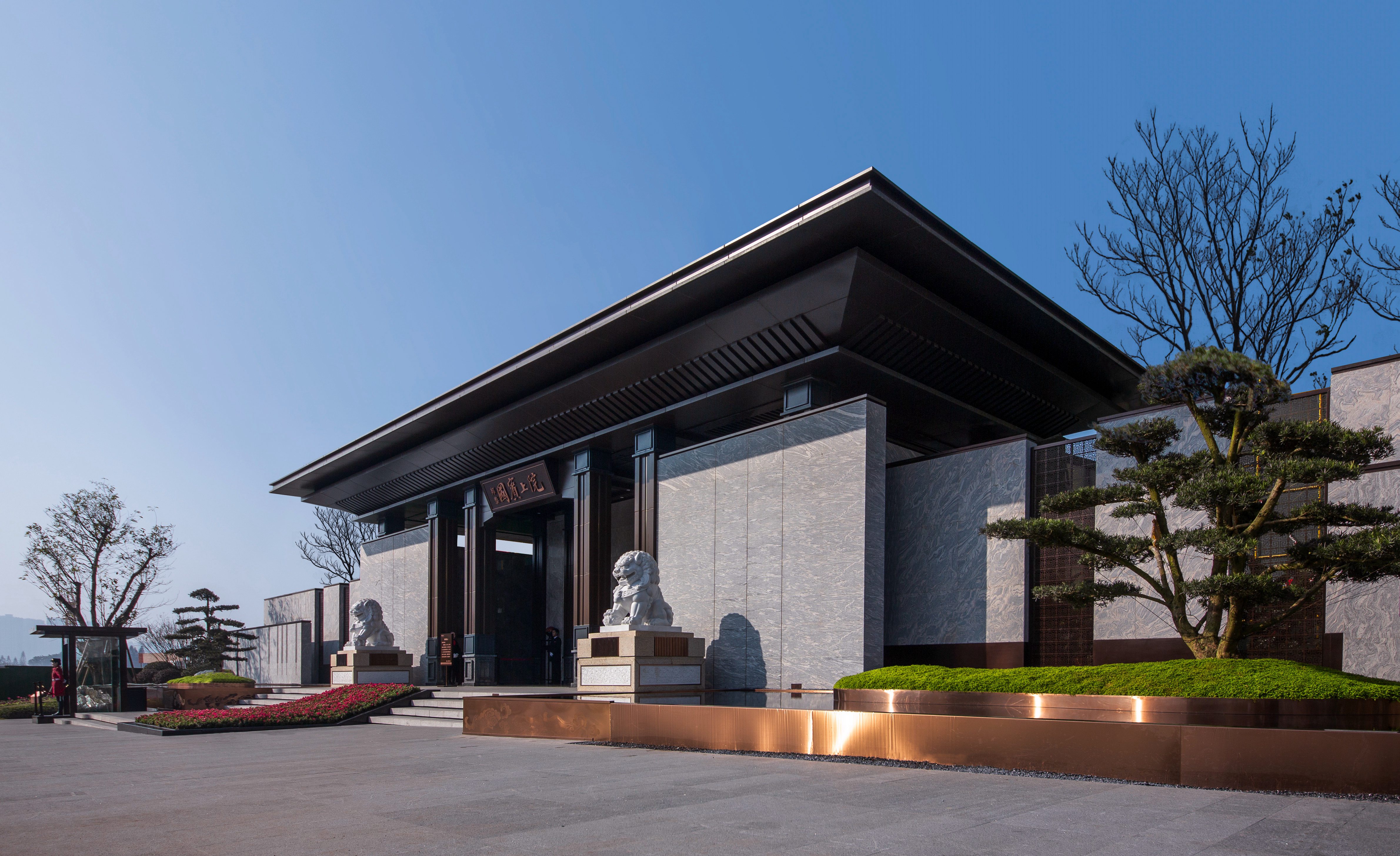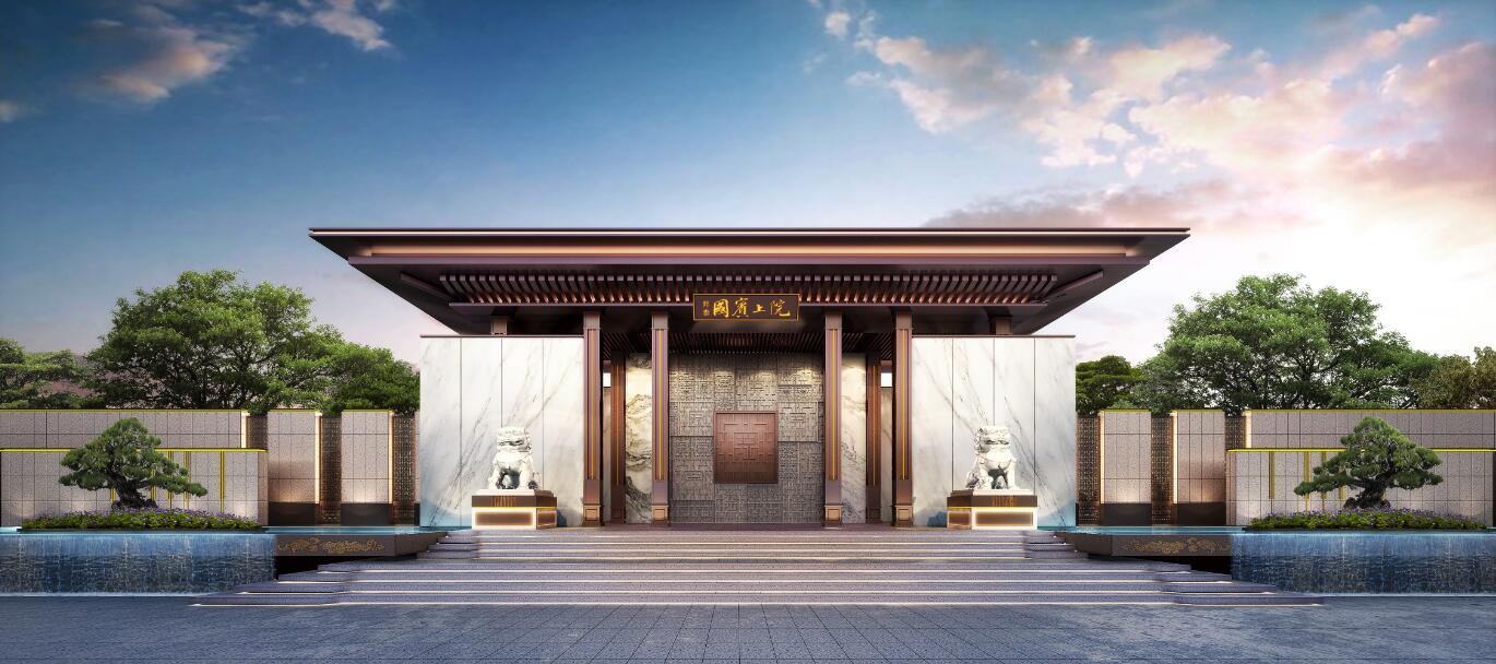 以中軸對稱布局鋪排新中式建筑的軒昂氣宇,登門望府,禮序歸家,彰顯高貴氣度,界定門楣榮耀。瑞獸分立兩側(cè),鎮(zhèn)守家安,中部立面由“院”字元素提取演繹形成項目獨(dú)屬的特征符號。隱其形、顯其性;簡于型、精于心。