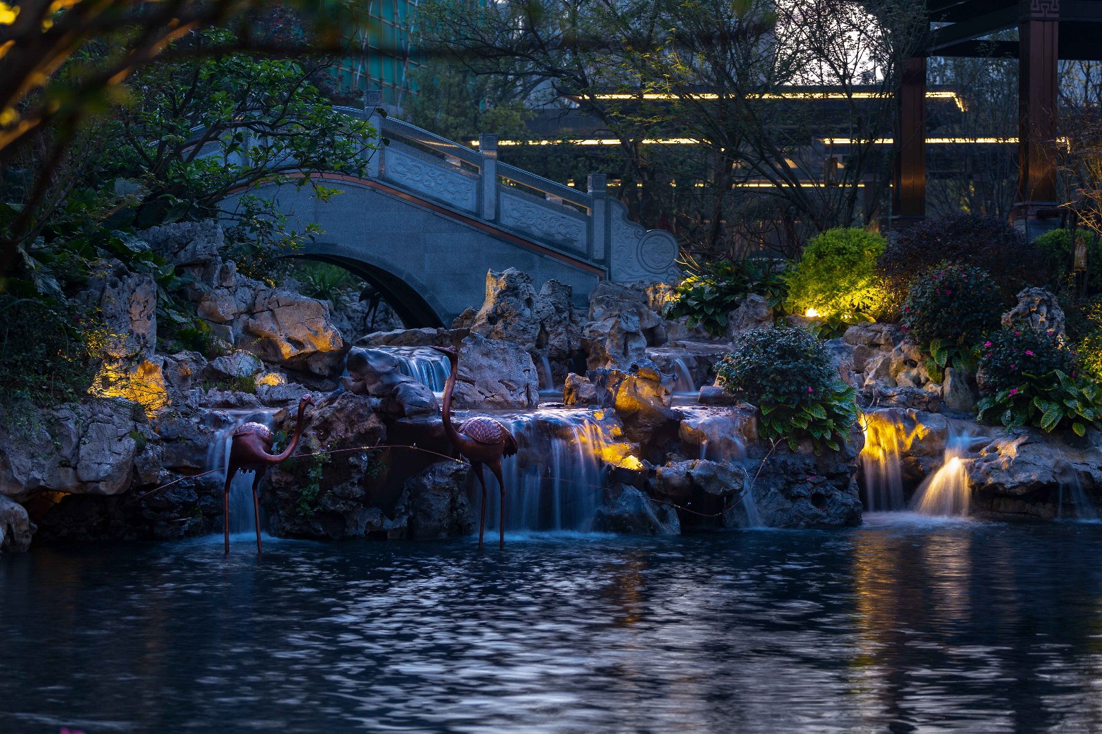 以橋為頓,作節(jié)奏區(qū),分恰好遇上了腳步忍不住要去停一停,橋下的半圓拱形與水面倒影自成美景。在疊水理石間神游園林美景,暢想人生大境 。