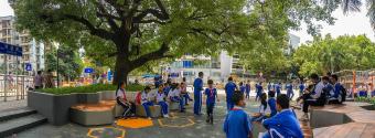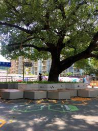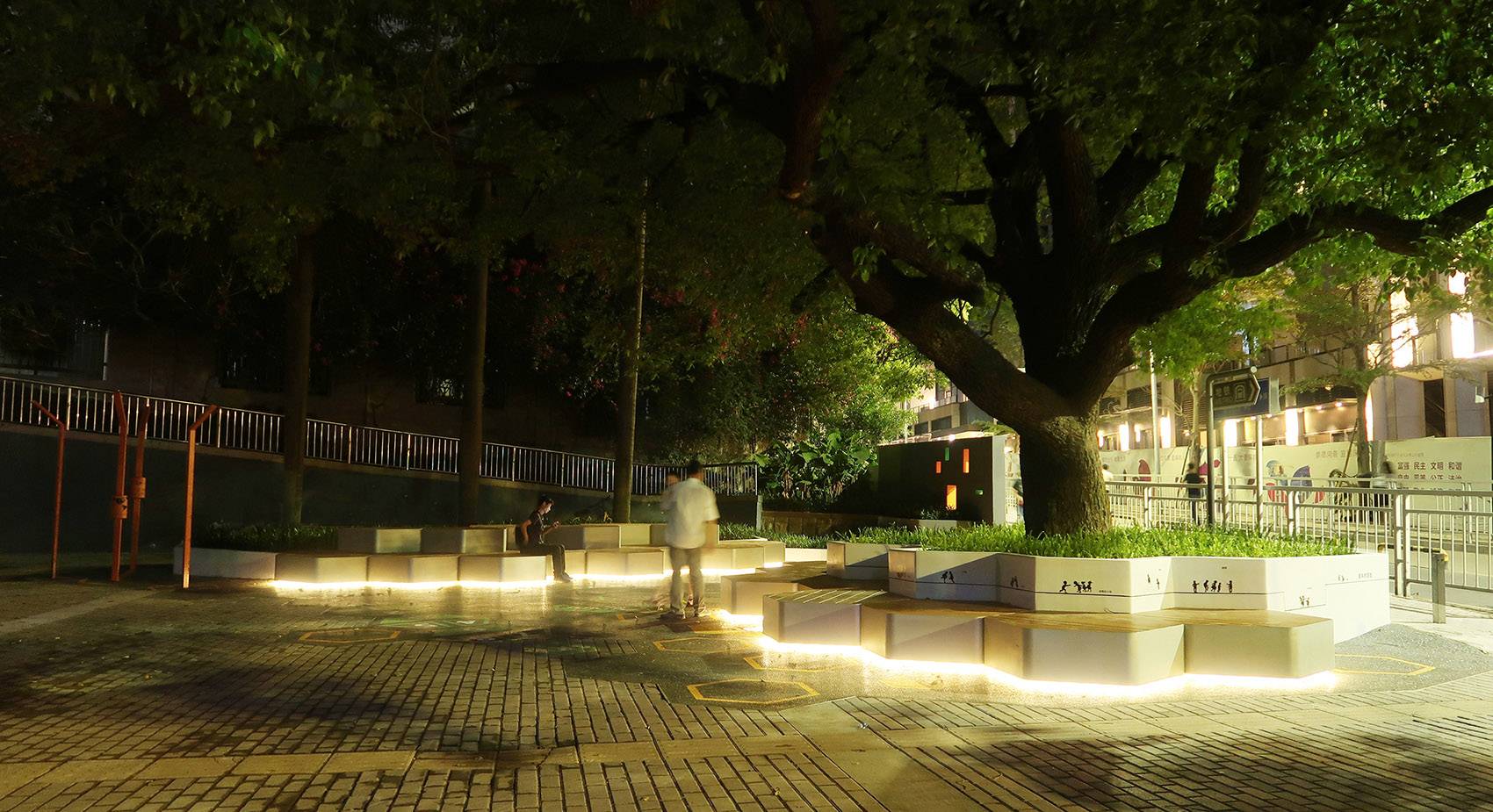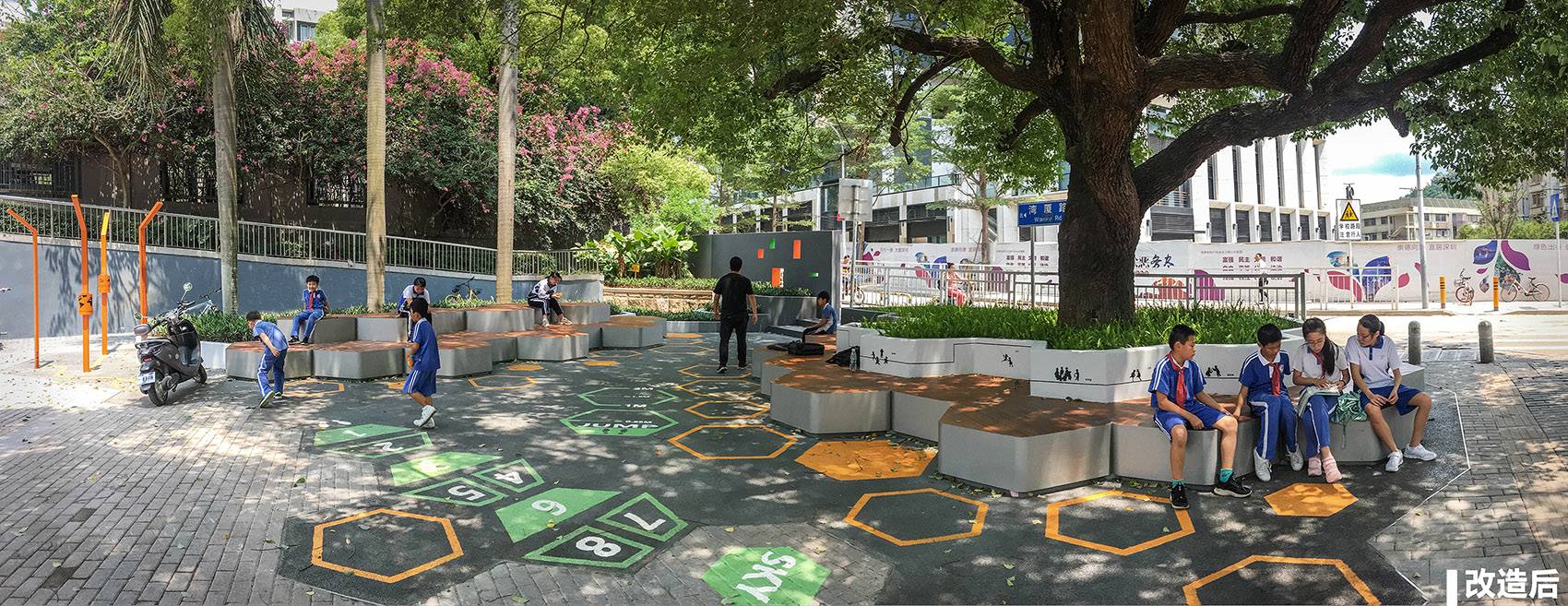 蛇口學(xué)校于1970年成立,周邊大多數(shù)居民在蛇口學(xué)校度過了自己的童年時光。當(dāng)他們的角色從孩童轉(zhuǎn)變?yōu)楦改笗r,他們的孩子也在蛇口學(xué)校開始了自己的童年時光。當(dāng)年的孩童變成了家長,在曾經(jīng)玩耍學(xué)習(xí)的地方,等待著自己孩子上下學(xué),這里即承載了他們回憶的青春,也承載著他們與自己孩子的共同回憶。在這個傳承著一代又一代人記憶的場地里,有一棵歷史悠久的大香樟,見證著場地和時間的變遷?!笆陿淠?,百年樹人”,設(shè)計改造尊重原場地的功能使用,重塑場所的空間秩序,以“光陰的故事”為主線,圍繞場所置入積木座椅,童年游戲連環(huán)畫,科普互動裝置、體能游戲圖案。從而,為使用者提供一處陰涼休息的等候空間、自由玩耍的游戲空間以及周邊居民休閑的共享空間,讓這個滿是記憶的廣場更有活力、更有趣。