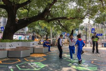 蛇口學(xué)校廣場位于蛇口花果路和灣廈路交匯處,作為高密度社區(qū)周邊少見的街角廣場,在上下學(xué)高峰時間,場地聚集了大量的家長及隨處停放的自行車和電動車。