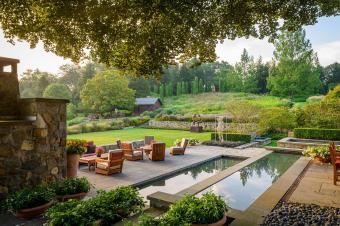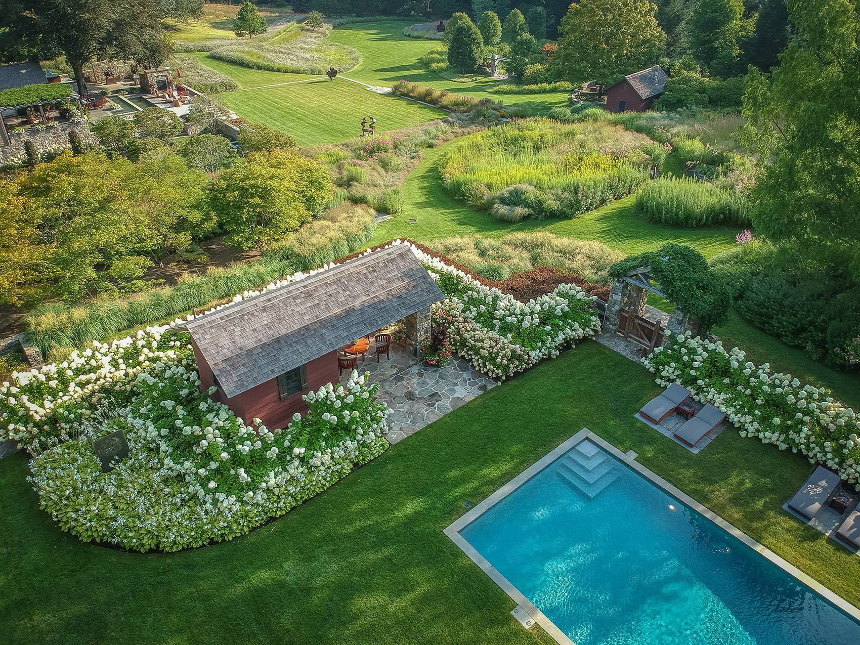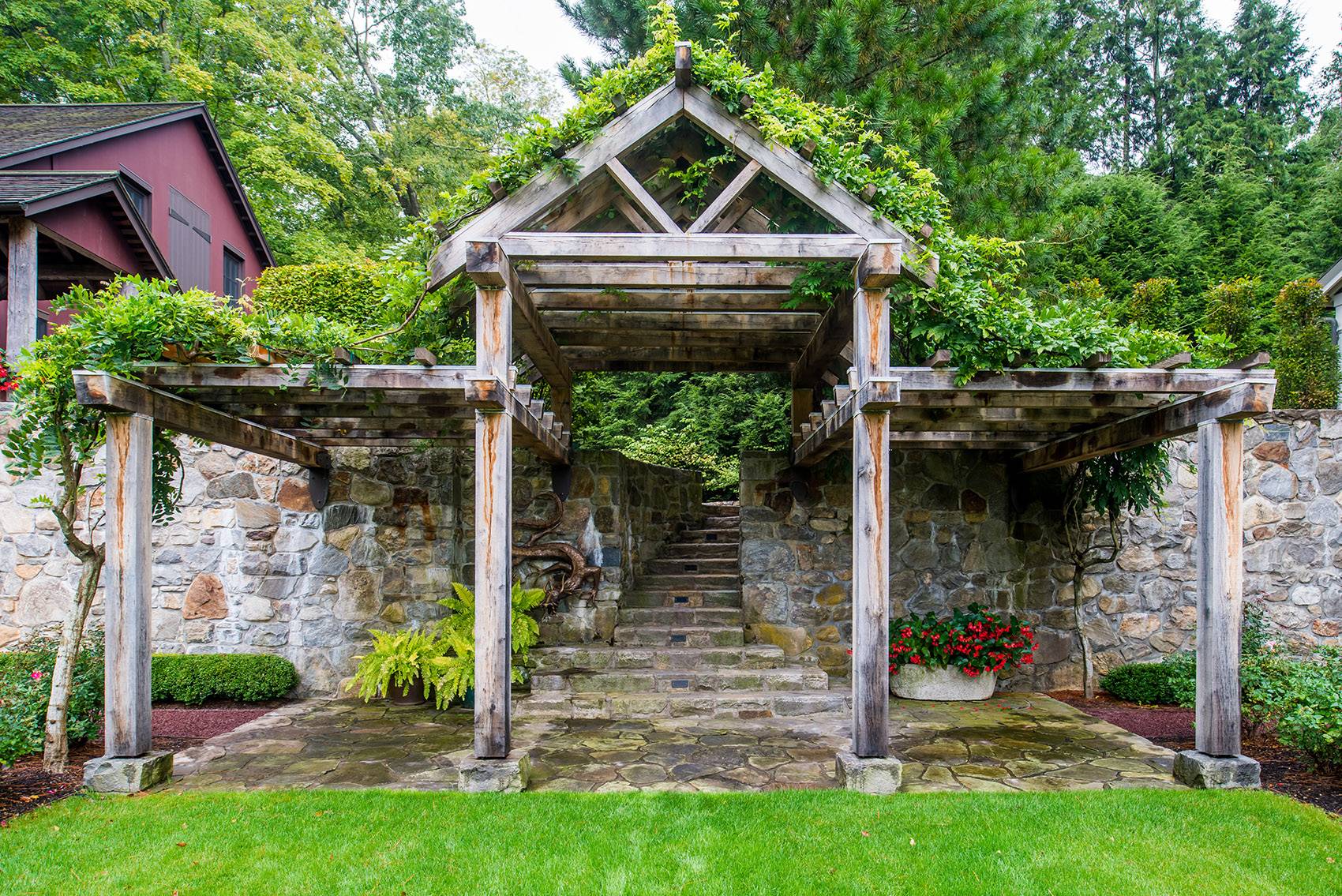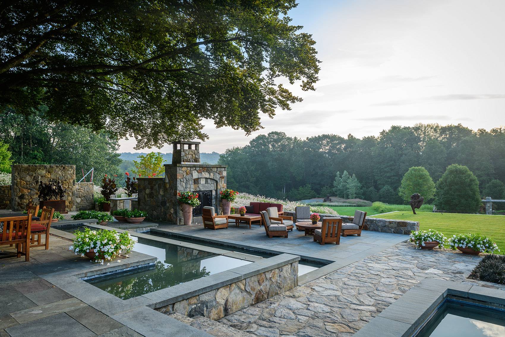 主要的生活平臺以入口處的住宅區(qū)為起點,一直向下延伸到休閑娛樂用的大草坪上。生活空間的特色包括被紫藤覆蓋的鄉(xiāng)村涼亭、各處水景和一處由75歲高齡的紫葉歐洲山毛櫸樹提供遮陰的用餐平臺。戶外廚房和披薩烤爐隱藏在大型的戶外壁爐之下。