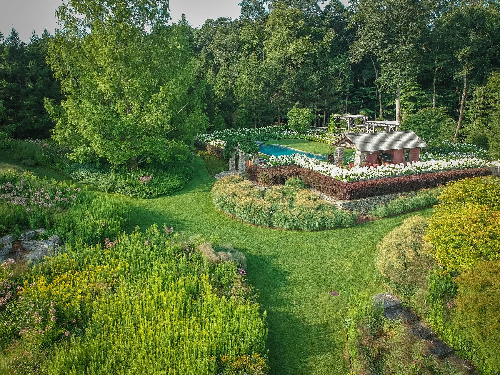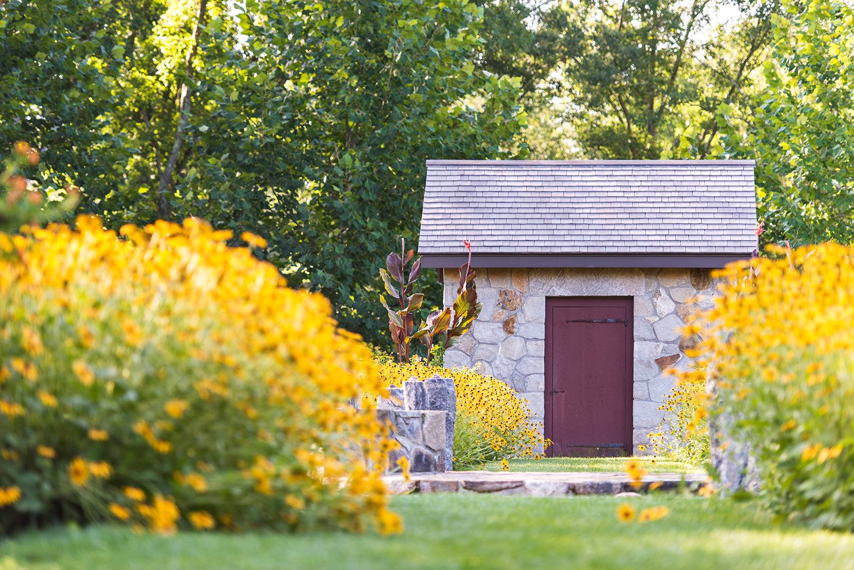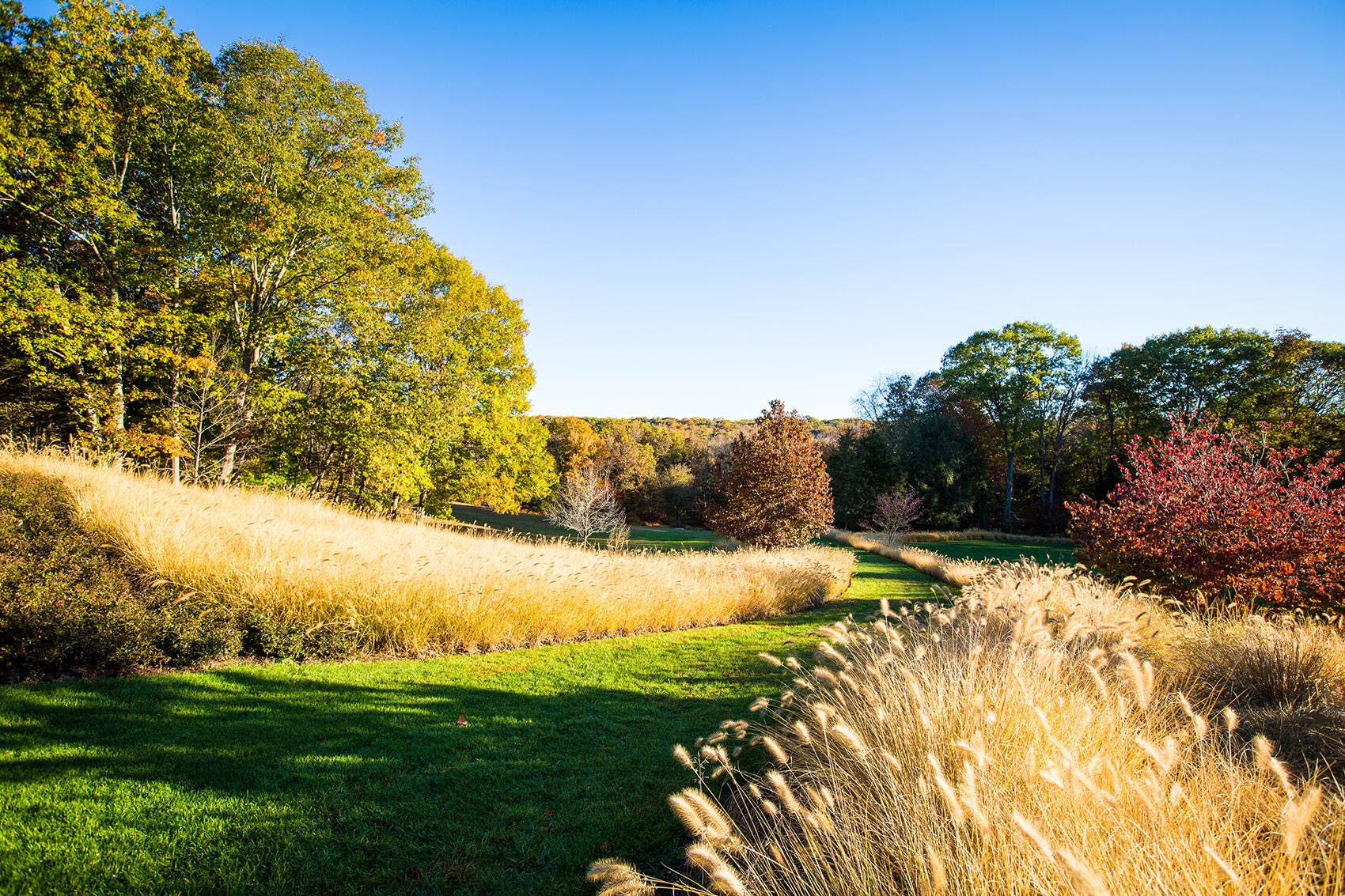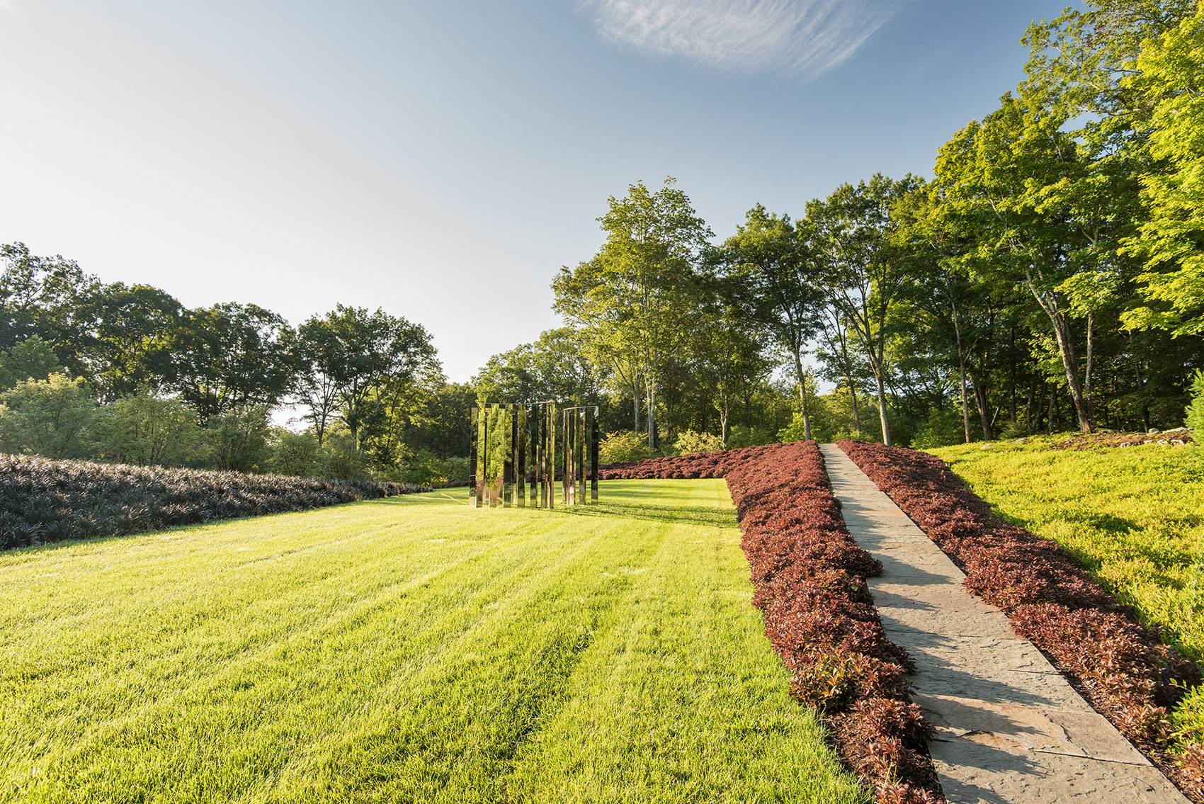 景觀設(shè)計師將八處水景作為各種空間的特色和焦點,同時還設(shè)計了一系列具象的藝術(shù)以便對景觀產(chǎn)生巨大的影響。所有的墻壁均由當(dāng)?shù)氐氖慕ㄔ於?,草地花園藤架也都是用當(dāng)?shù)乜撤ズ痛蚰サ陌紫鹉敬罱ǘ傻摹B访嫔系那嗍瘎t來自距離花園75英里以內(nèi)的采石場。設(shè)計師號召當(dāng)?shù)氐氖止に嚾藚⑴c花園的建造過程,以強(qiáng)調(diào)其可持續(xù)發(fā)展的戰(zhàn)略措施。此外,設(shè)計師主要使用當(dāng)?shù)氐闹脖?,以?chuàng)造一種富有彈性的環(huán)境,同時使花園能夠更加和諧地融入康涅狄格州的鄉(xiāng)村環(huán)境。