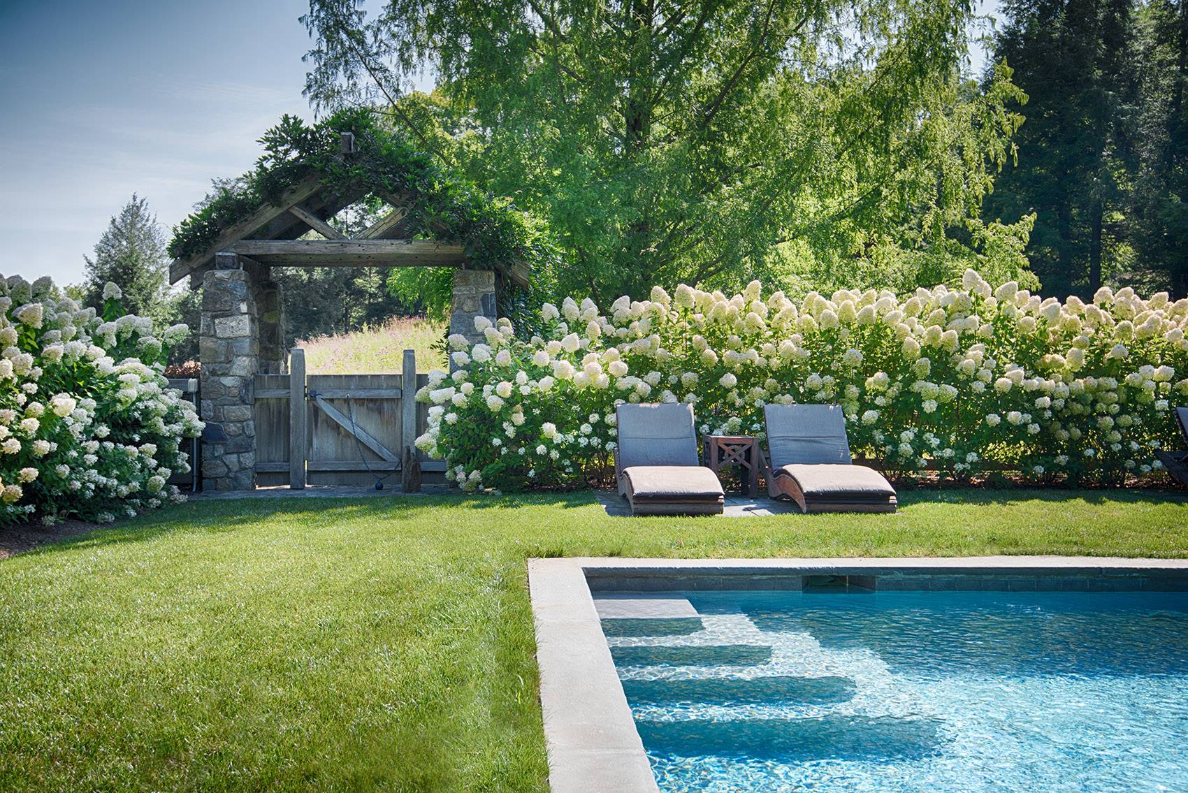 ▼白色的繡球花構(gòu)成了泳池區(qū)的入口