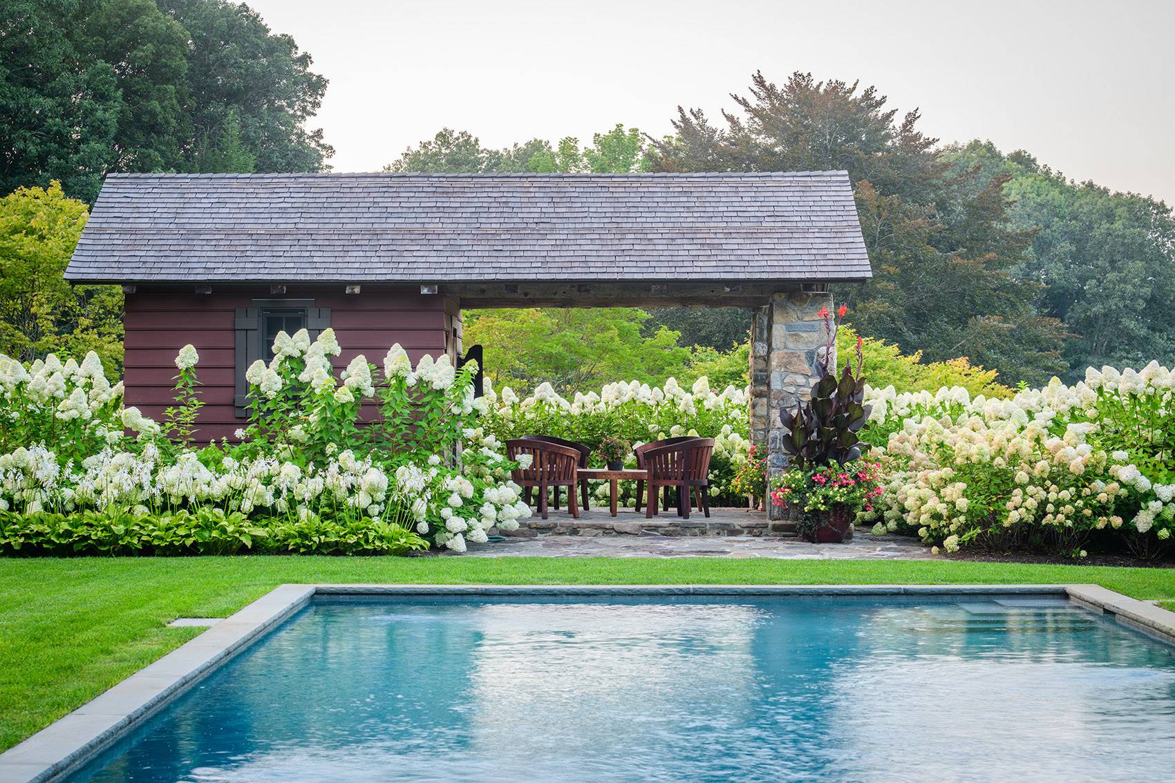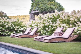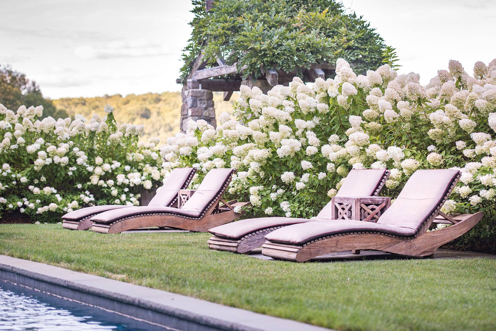 ▼泳池邊的休息座椅區(qū),以白色繡球花為背景