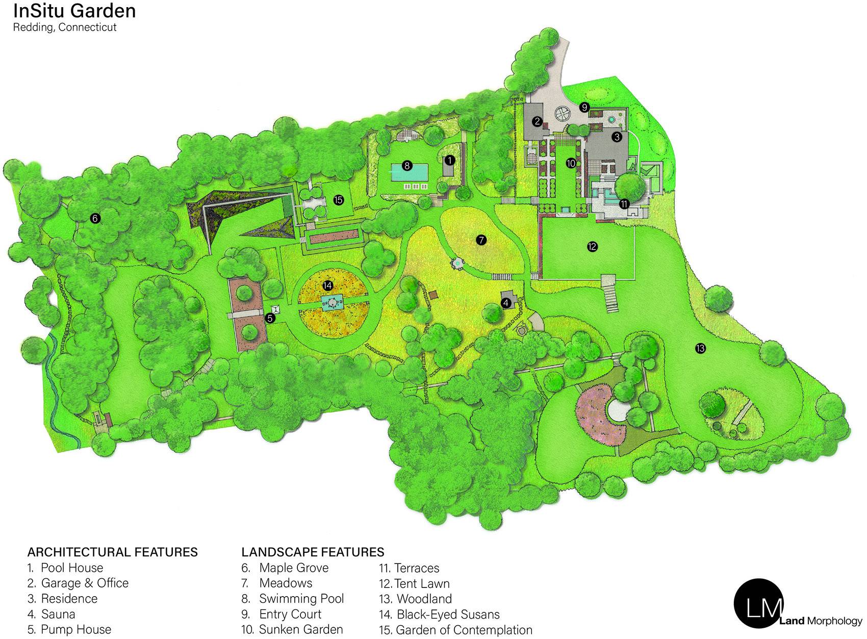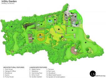 位于美國加州雷丁的InSitu花園景色優(yōu)美,其特色是使用了大量當(dāng)?shù)氐慕ㄖ牧虾褪┕ぜ?xì)節(jié)。八英畝起起伏伏的地形被劃分為十幾個主題花園。來訪者可以通過一條綠樹成蔭的車道進(jìn)入一個鋪設(shè)著紅色礫石的停車場空間,此外,入口廣場中心位置的地上還嵌著一個大圓形浮雕。