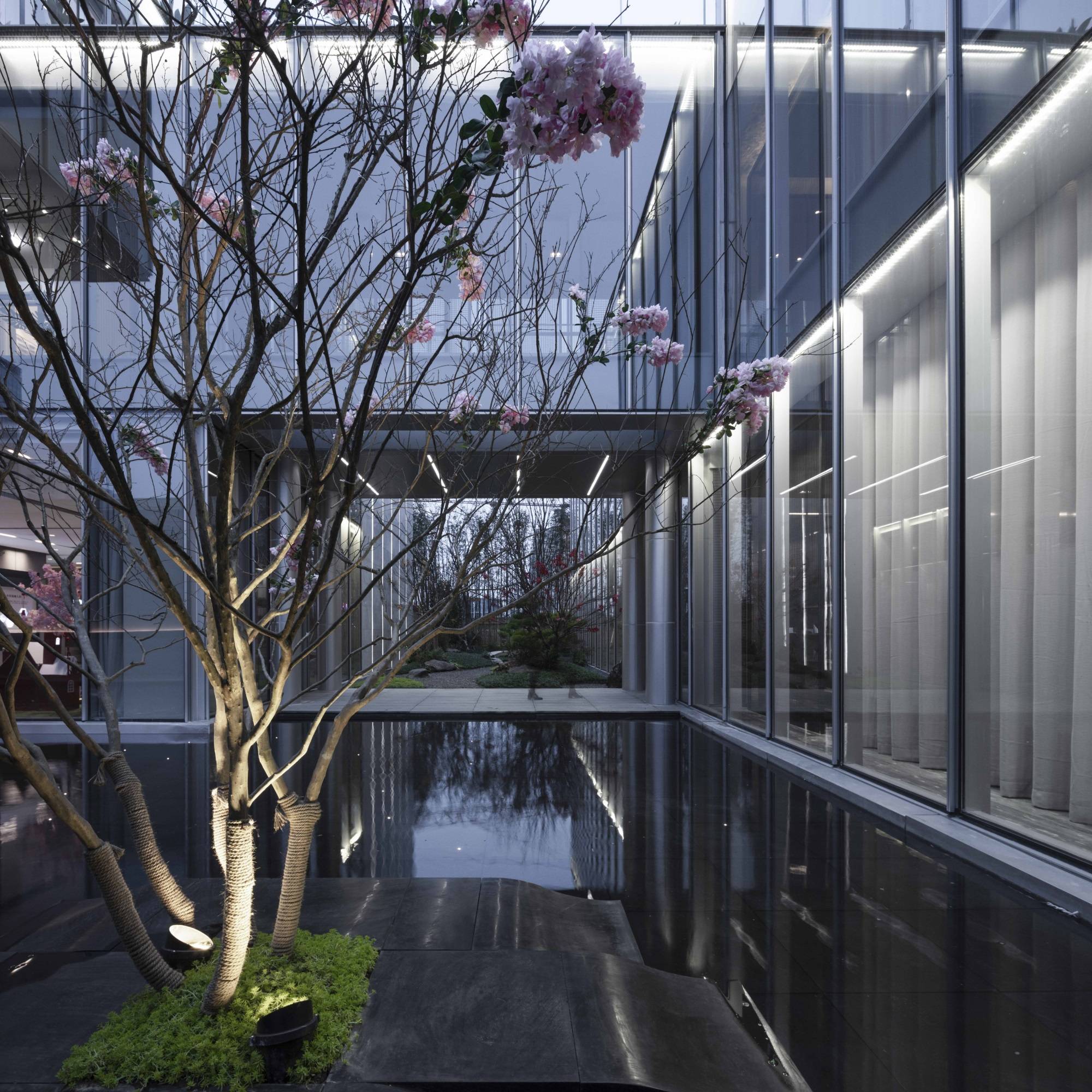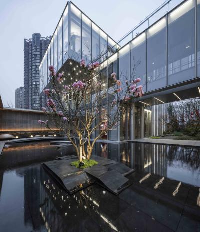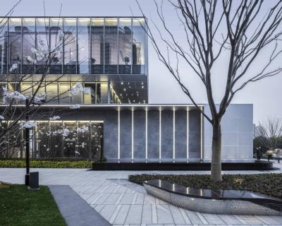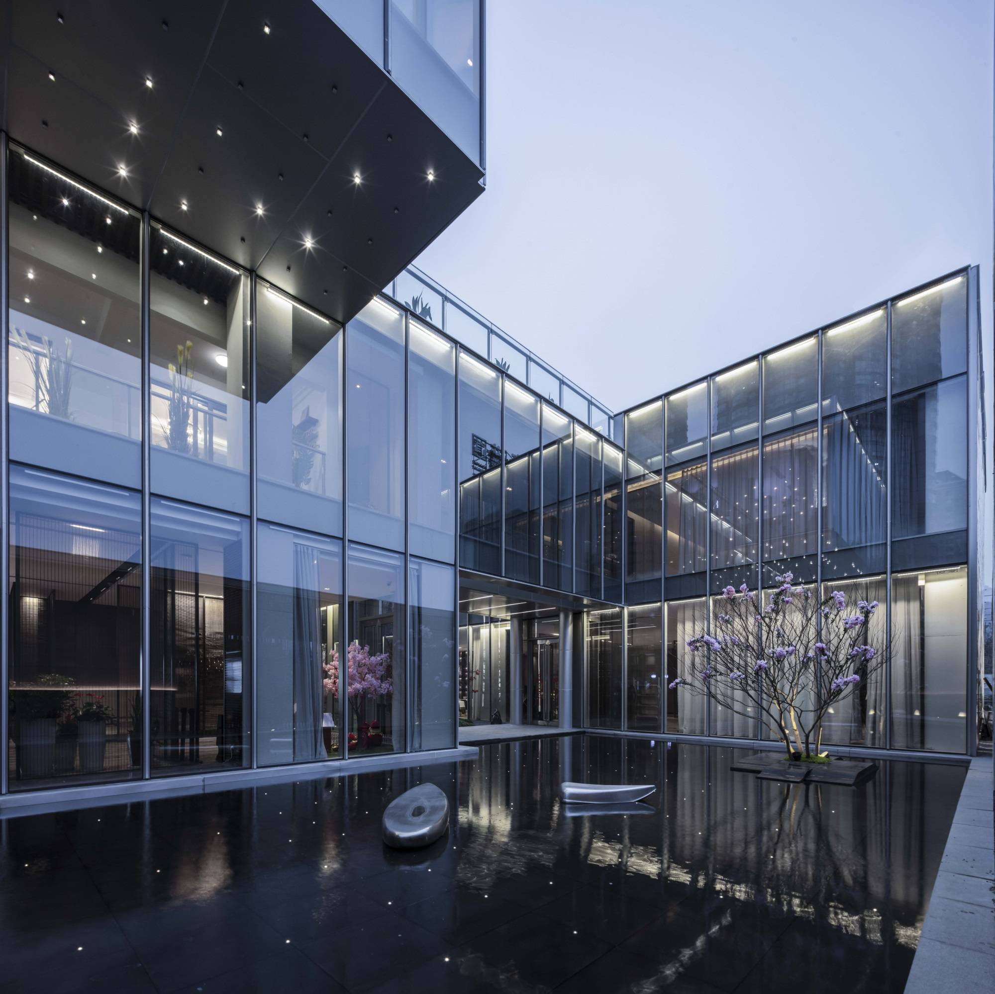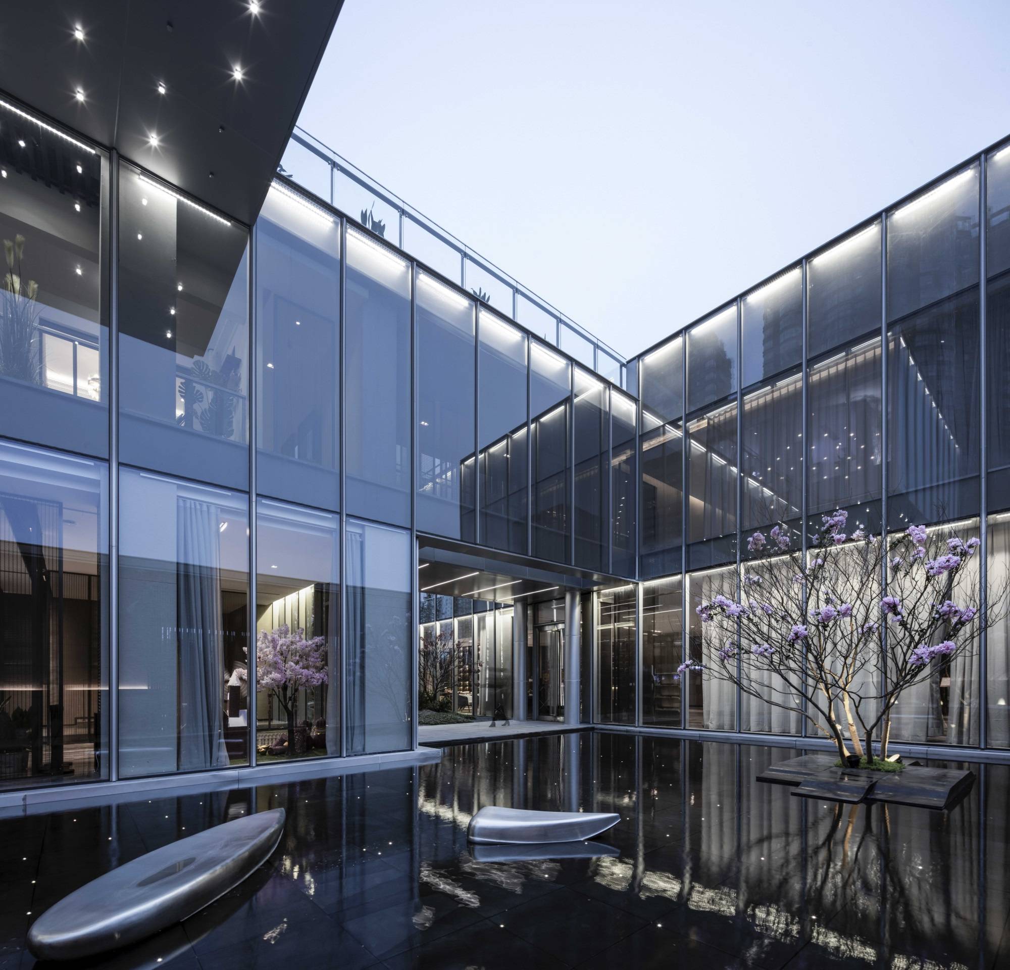 建筑通過體塊的穿插、虛實的結(jié)合,以大面積的玻璃與淺色石材的拼接,為整個項目打造了一個空靈剔透的“城市雕塑”形象。在此基礎(chǔ)上,景觀設(shè)計最大化地發(fā)揮這一優(yōu)勢,加入藝術(shù)化的景觀處理手法,將示范區(qū)打造成一座冷靜克制、尊貴疏離的藝術(shù)殿堂。