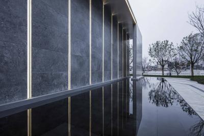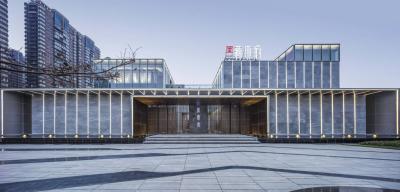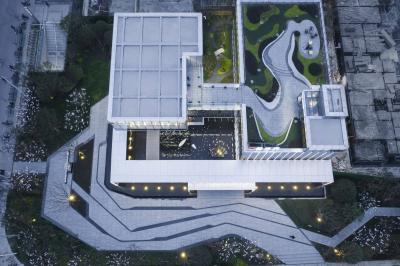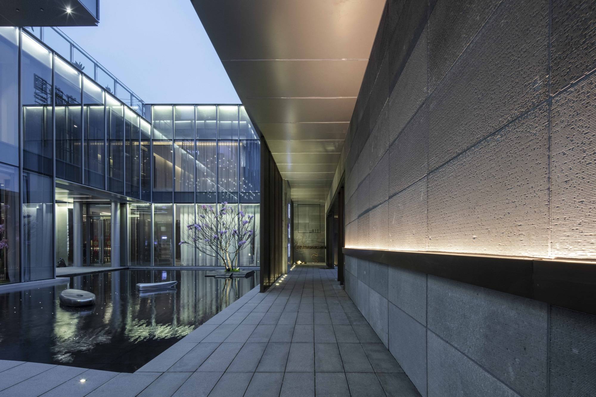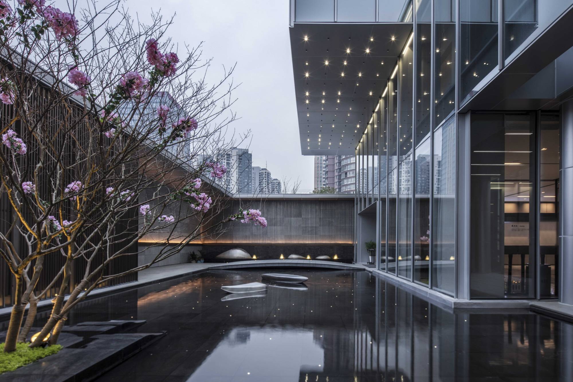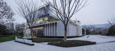 建筑通過體塊的穿插、虛實的結(jié)合,以大面積的玻璃與淺色石材的拼接,為整個項目打造了一個空靈剔透的“城市雕塑”形象。在此基礎(chǔ)上,景觀設(shè)計最大化地發(fā)揮這一優(yōu)勢,加入藝術(shù)化的景觀處理手法,將示范區(qū)打造成一座冷靜克制、尊貴疏離的藝術(shù)殿堂。