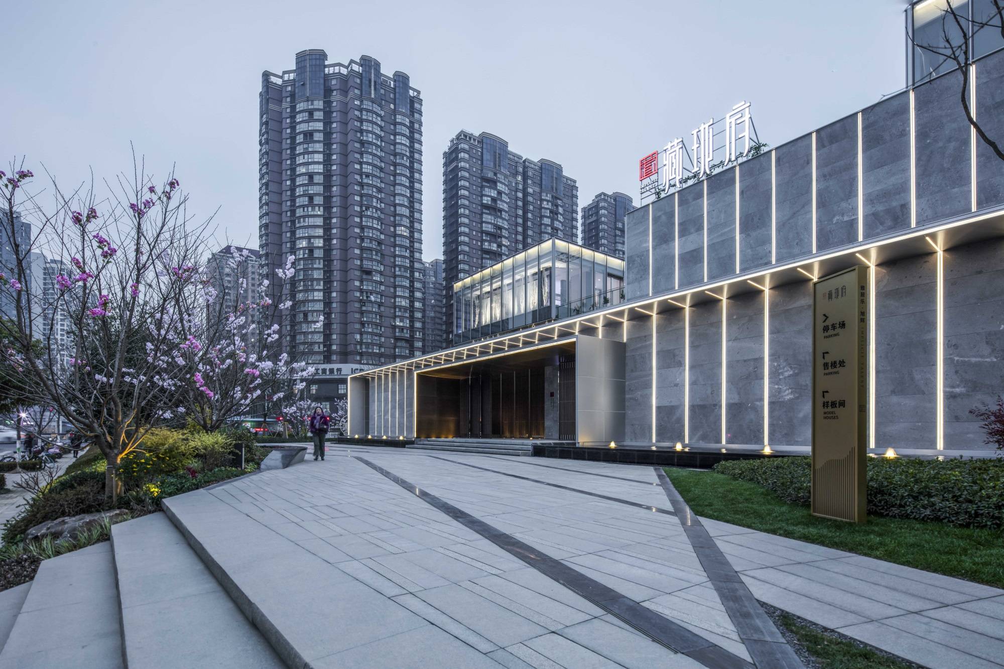 旭輝藏瓏府示范區(qū)位于道路轉(zhuǎn)角處,緊鄰地鐵站,交通可達(dá)性強(qiáng),但同時場地空間有限,建筑體塊將整個空間分割得較為瑣碎,DDON笛東設(shè)計團(tuán)隊整合了零碎空間,并將空間進(jìn)行一體打化造。