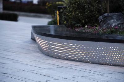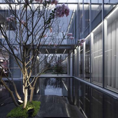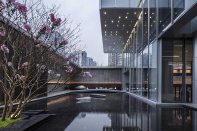 大面積的鏡面水與建筑的透明玻璃鏡面相互呼應(yīng)。幾何線型的種植池配合點睛大樹,形成視覺焦點。