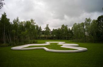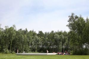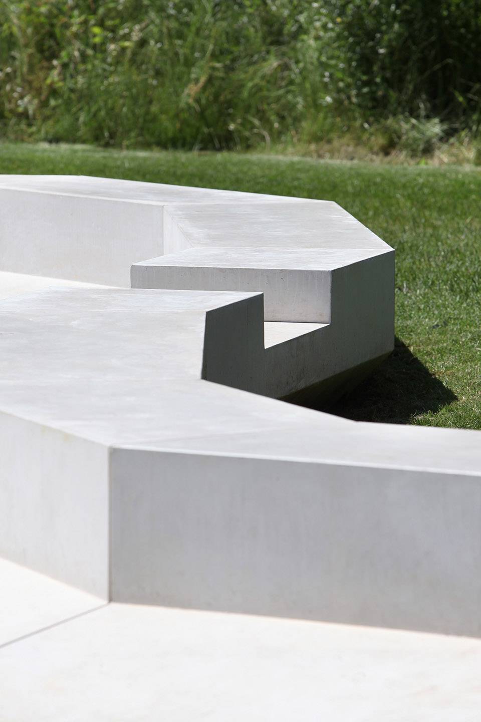 項(xiàng)目呈一個(gè)大尺度的封閉矩形,圈出內(nèi)部一片空地??盏匚挥趯掗煹牟萜荷?,連接著幾片樹林。家具裝置尺度和水平形態(tài)的設(shè)計(jì)都是設(shè)計(jì)師有意為之。巨大長(zhǎng)椅從地面冒出,單一線條圍合成一個(gè)不規(guī)整的環(huán)形。它借助低矮的輪廓線完形成一個(gè)虛構(gòu)的室外房間,其形狀清晰地界定出室內(nèi)與室外區(qū)域。