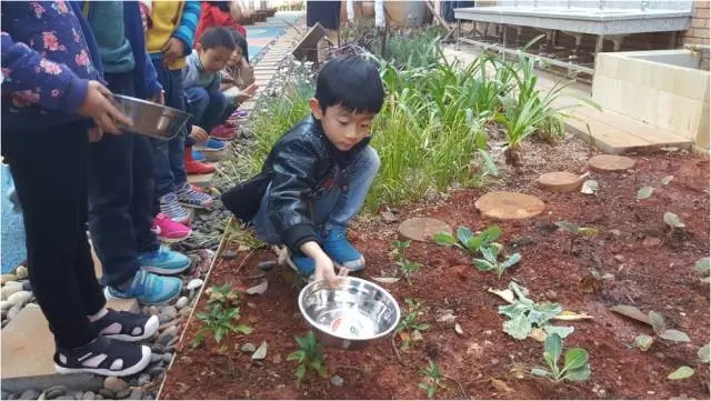 小朋友在老師帶領(lǐng)下于這里親近自然,學(xué)習(xí)種植蔬菜和使用雨水收集罐,在勞動中體會到收獲的樂趣以及感受到人和大地的關(guān)系定位。