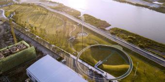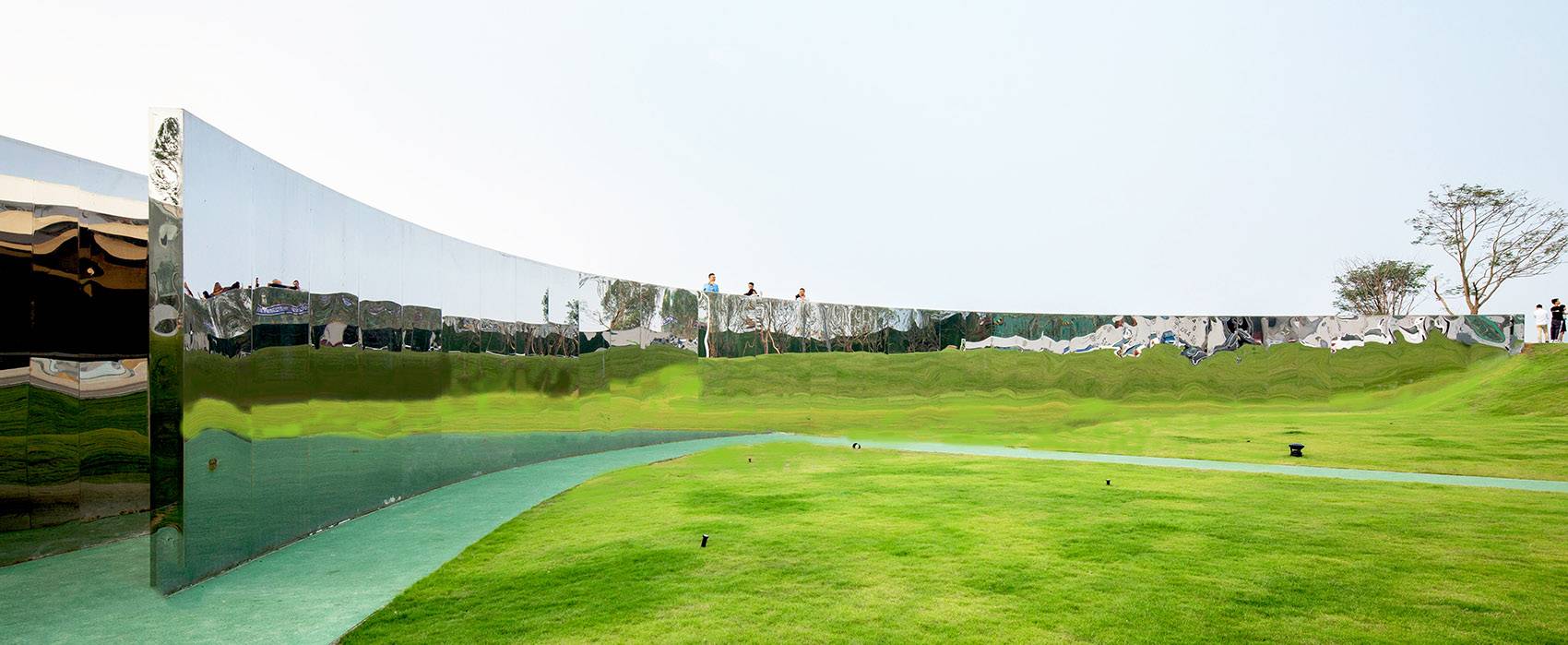 堤壩是一種權(quán)力和力量的象征,它可以切割河床及一切的動(dòng)植物自然棲息地。堤壩同時(shí)是一種守護(hù)的象征,它保護(hù)了人們免受洪水的傷害。所以在這里我們希望傳遞出事物的對(duì)立性和共融性,用鏡面不銹鋼材料做一條圓形的“堤壩”,一半真實(shí)的自然,一半鏡子里的自然。圓形沒有起點(diǎn)和終點(diǎn),一切都虛實(shí)圓融于自然中。