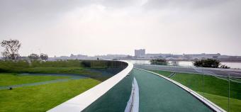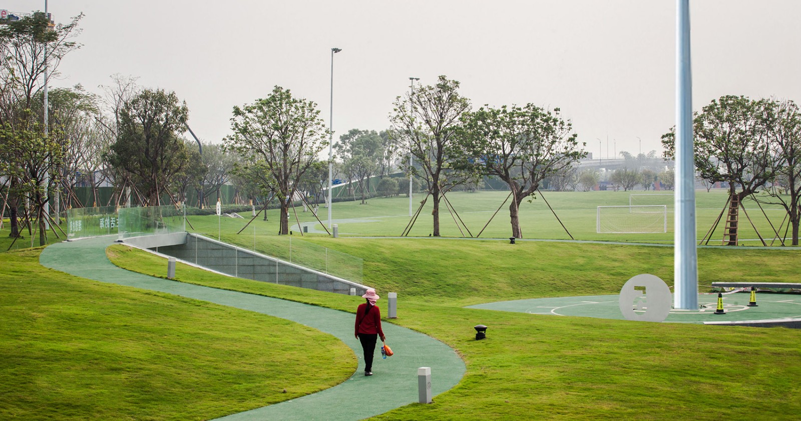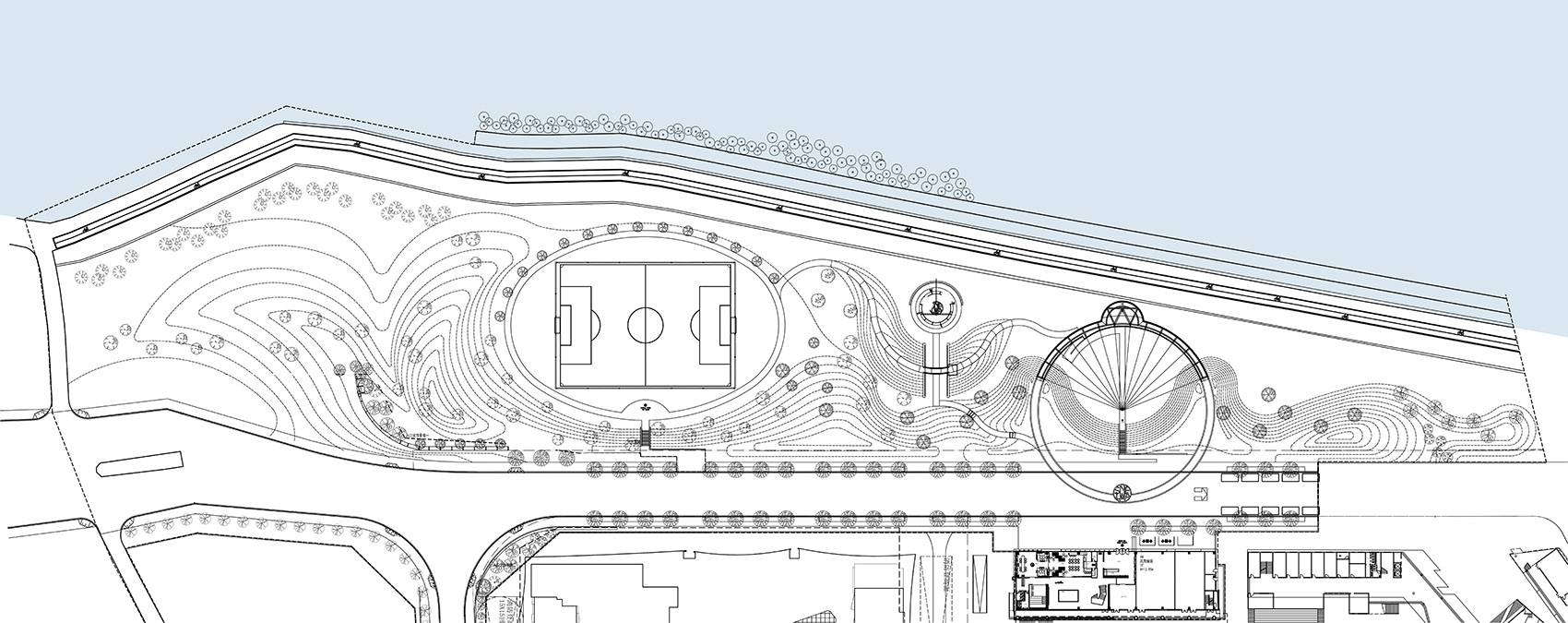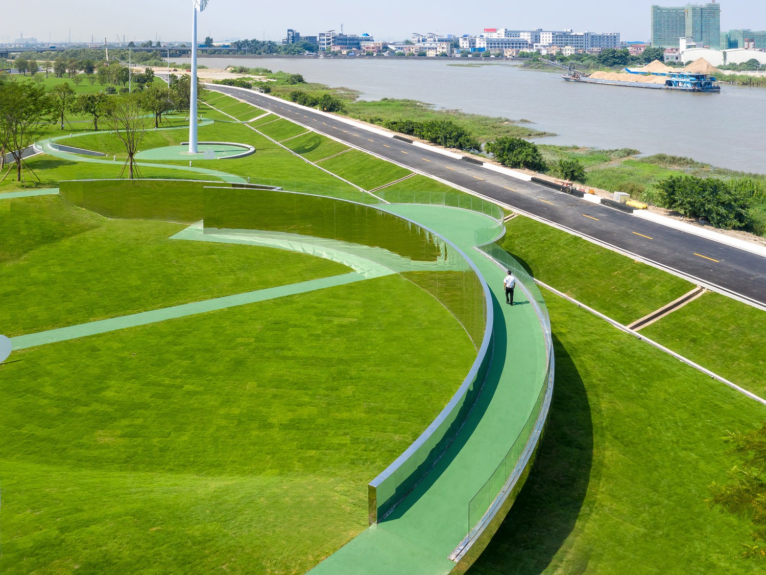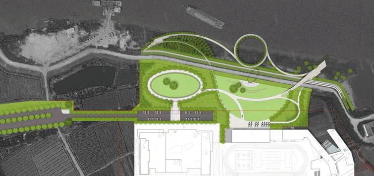 在沒有建立堤壩以前,堤壩內(nèi)側(cè)是河床的一部分,常年的江河沖刷留下豐富的水紋肌理,這些凹凸變化的河床肌理,為水生動(dòng)植物提供了很好的庇護(hù)。我們延續(xù)河床的肌理,用大地藝術(shù)的手法塑造了豐富的地形變化,起伏的地形很好的解決了U型下凹綠地與外部的視線和交通關(guān)系,并且創(chuàng)造了很特別的場(chǎng)地和空間行走體驗(yàn),人在場(chǎng)地活動(dòng)就像魚類很自由的在他們的河床棲息。