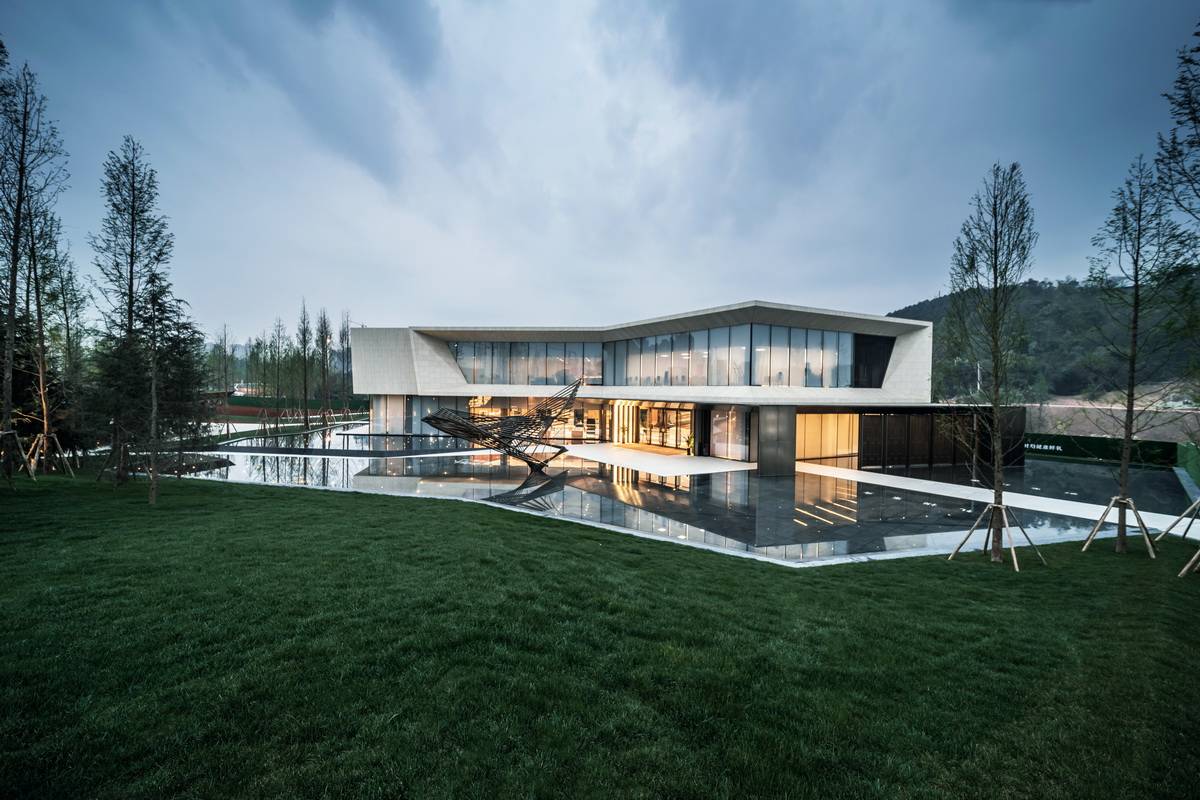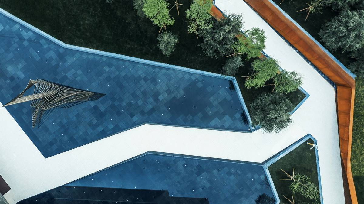 沿著切割的水面一邊通往社區(qū)活動中心一邊也連接了依勢而生的下沉劇場。每處功能空間都由幾何形草坡自然地間隔開,使得每一處轉(zhuǎn)角都形成不同尺度的活動場所,激發(fā)使用者不同的行為活動。