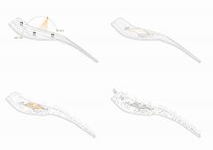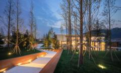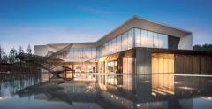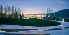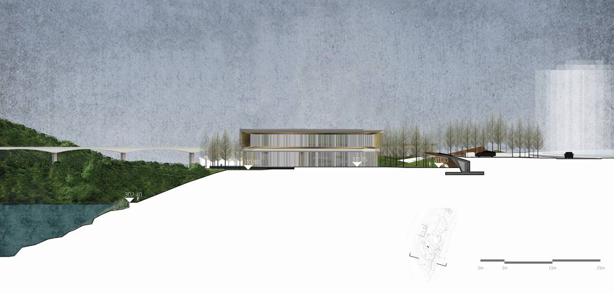 轉(zhuǎn)折的道路也衍生出沿途的活動場地,從立面翻轉(zhuǎn)而上的巨大懸挑創(chuàng)造了下方陰涼的休憩空間,同時也提供了上方一處觀賞瀨溪河全景的平臺。