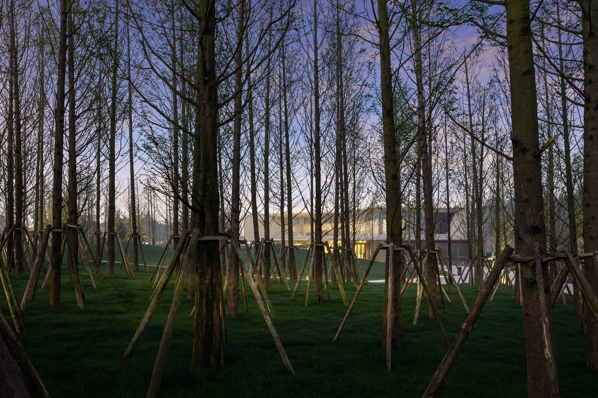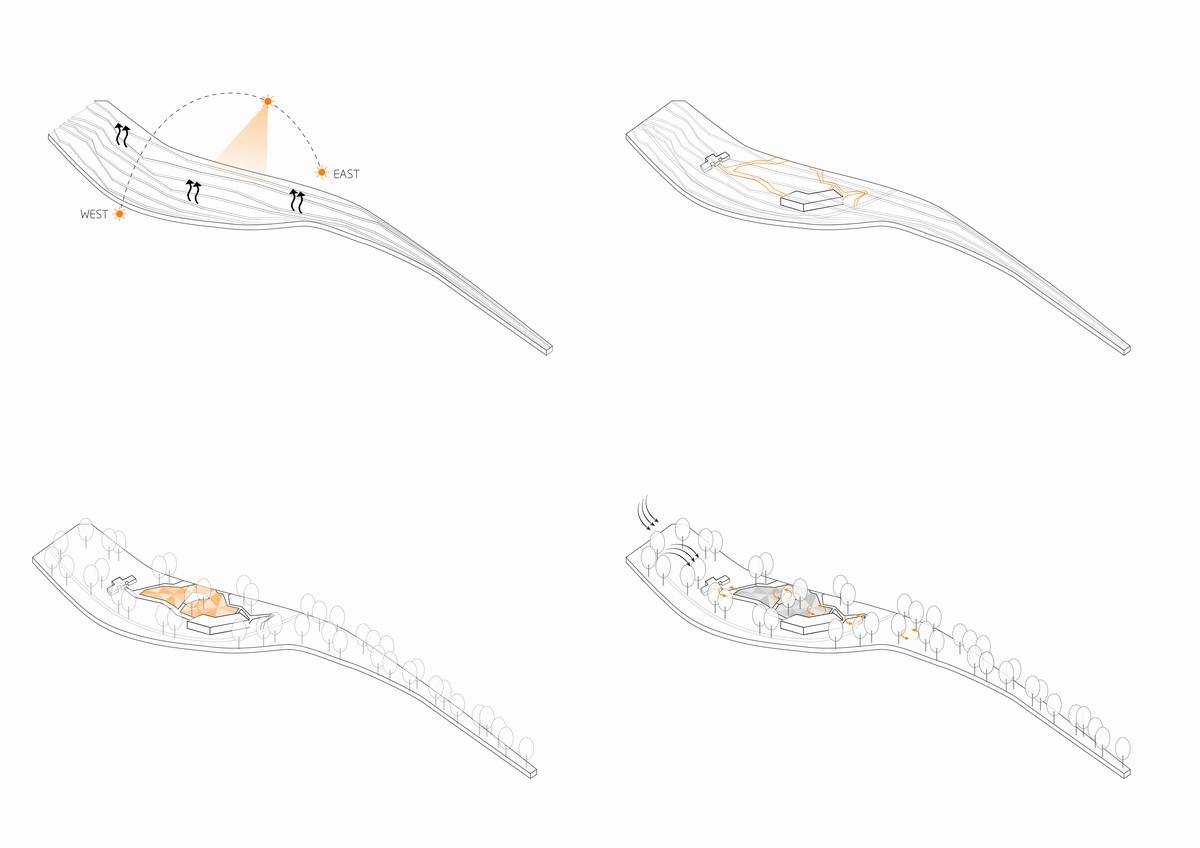 于是設計選擇了在場地上進行切割的方式,一方面利用場地本身的高差來制造通道和活動空間,一方面通過東北——西南方向切割的地形引入北風,加上環(huán)繞的水杉密林,讓整個場地形成一套自己的降溫系統(tǒng)。