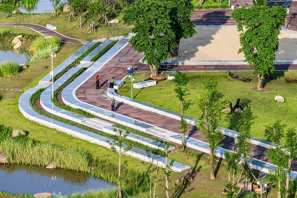 175m高程以上的區(qū)域,局部抬高現(xiàn)狀地形,營造陽光草坪、兒童沙坑、草地臺階、自行車環(huán)道等供人們休閑體驗(yàn)的多功能復(fù)合型景觀空間。