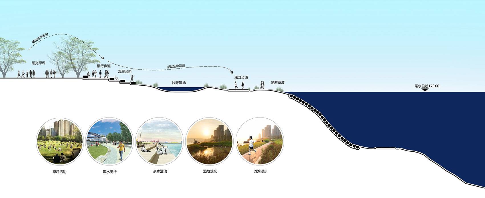 設(shè)計高程175-173m,將打造濕地風(fēng)貌景觀,營造雨水花園,種植濕地植物,利用經(jīng)過江水沖刷形成的自然灘涂,打造適合市民進(jìn)行燒烤、露營的親水空間。