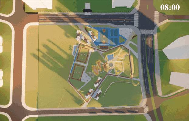 重慶素有火爐之稱。在實(shí)地考察時(shí),設(shè)計(jì)團(tuán)隊(duì)發(fā)現(xiàn)周邊樓盤的影子恰好覆蓋在地塊中,而公園人流最盛莫過于早晚時(shí)分,由此萌生結(jié)合當(dāng)?shù)厝照窄h(huán)境布置園區(qū)景觀功能的想法,以降低場(chǎng)所能量的損耗,增加使用者的舒適度。