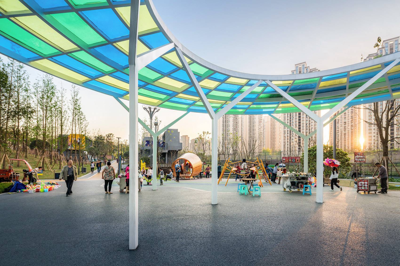 ▼公園中心廊架遠(yuǎn)景,色彩鮮明、造型質(zhì)樸