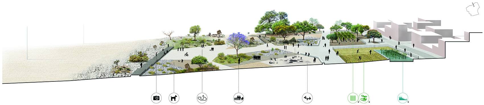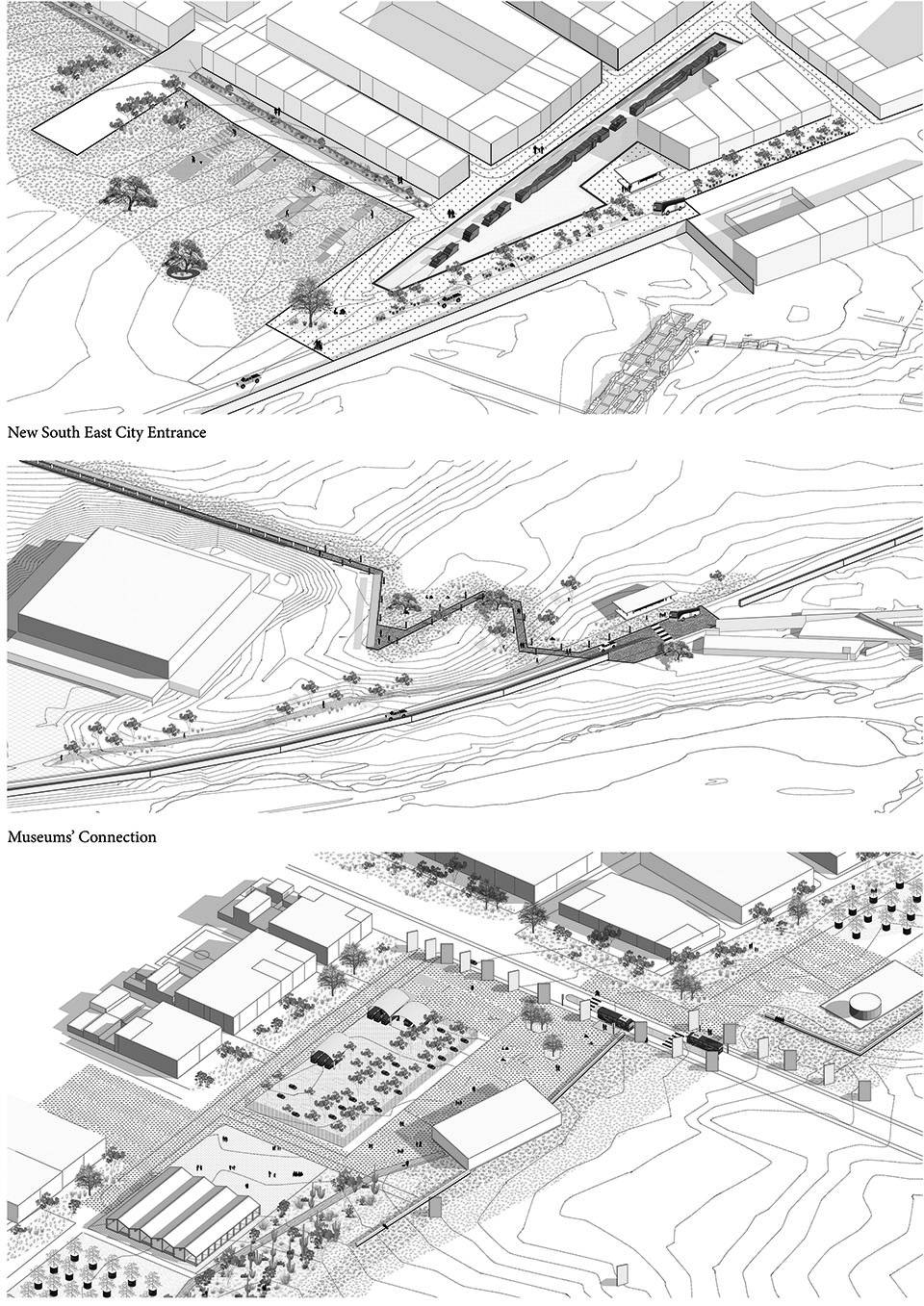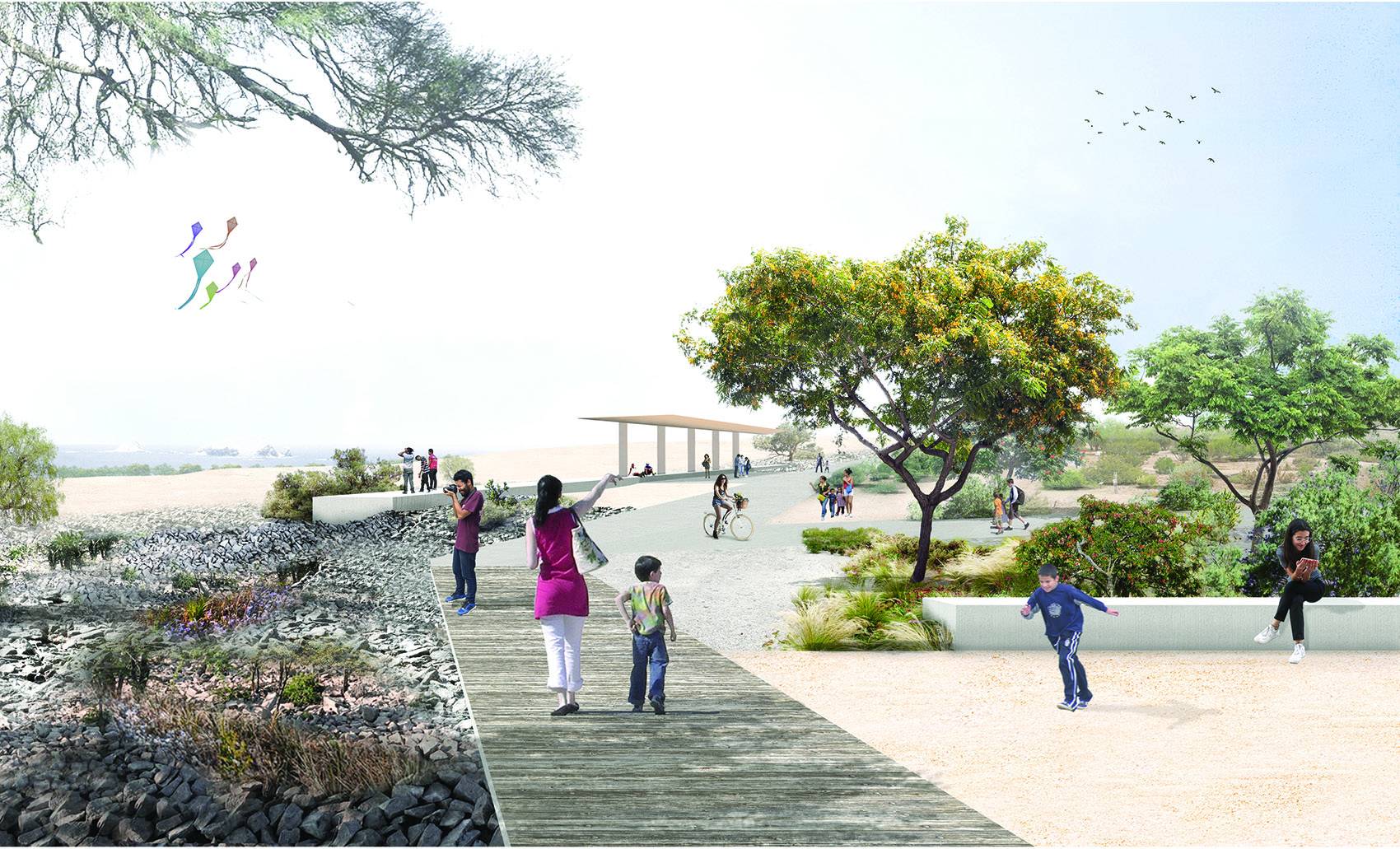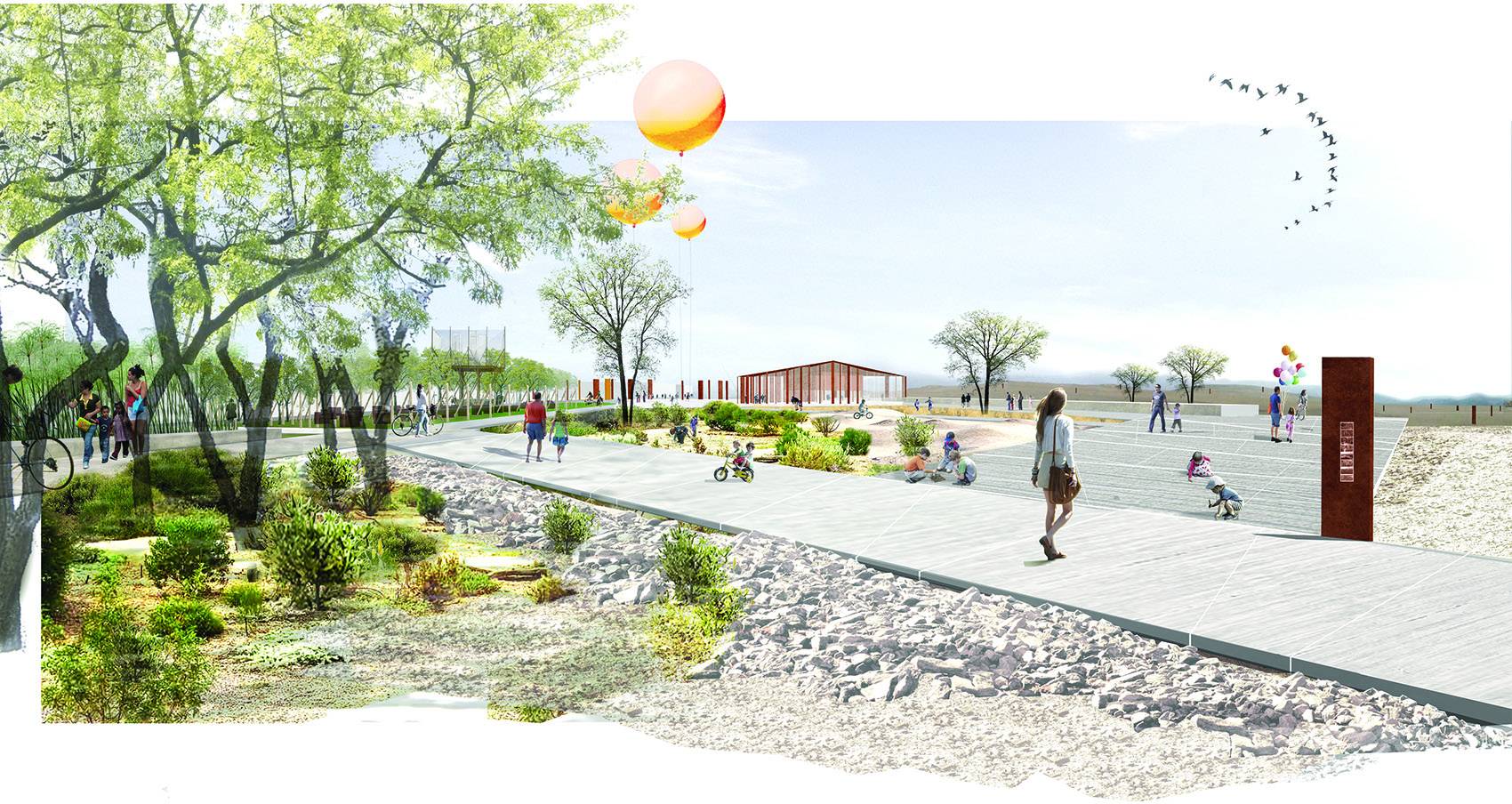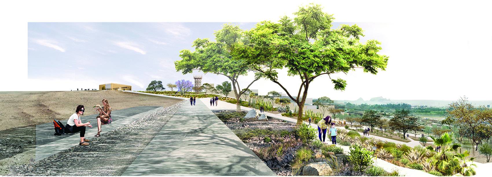 2. “環(huán)境帶”是公園內(nèi)部的瑰寶:這里有一系列豐富多樣的環(huán)境體驗,而這些環(huán)境體驗還與公園的不同文化空間、體育空間和開放性空間等相關聯(lián)。在公園的西北部分,輕度干旱區(qū)域、中度干旱區(qū)域和極度干旱區(qū)域的環(huán)境特征暴露無遺。在公園的西部,環(huán)境帶的重要性則被進一步地突顯了出來——它變成了一個當?shù)氐闹参飯@,不僅有助于組成國家博物館的框架,還使得該地區(qū)能夠與沿海的生態(tài)系統(tǒng)在未來產(chǎn)生聯(lián)系。而在環(huán)境帶西北側(cè)的Tello區(qū)內(nèi),通過組織人們的行為活動,形成了一個城市園藝試驗場,該園藝試驗場包含著LAB實驗空間、城市規(guī)模尺度的植物園區(qū)和高品質(zhì)的開放式礦產(chǎn)空間。