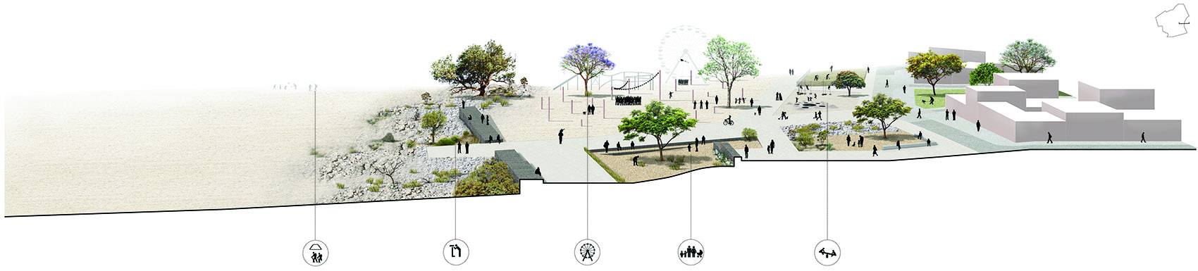 本項目由巴黎建筑規(guī)劃景觀事務所KH STUDIO的兩位建筑師delli Pont和Novielli與來自YDEA的建筑兼城市規(guī)劃師Elaine Sanchez和Diego Morales Bolognesi、以及來自APU的Rodrigo Apolaya共同完成。作為法國和德國境內(nèi)Europan Europe Palmares競賽獎項的前獲勝者,這支年輕的設計團隊目前正在展開一系列關于歐洲和拉丁美洲城市狀況的調(diào)研活動,并設計出了這個名為“在神話的海岸上”的景觀規(guī)劃項目。