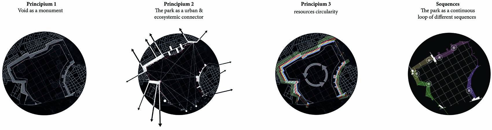 隨著時間的推進,本項目的設計戰(zhàn)略將一步步地構(gòu)建出屬于這座公園的整體面貌,即“神話”。為此,在本項目中,建筑師提議將時間作為一系列連貫的“演化視野(Evolutive Horizons)”。每個階段都有一個景觀主角和適應場地的新型空間條件,從而限定出每一個景觀視野。此外,每個景觀視野都有一定的自主性,可以隨時對項目進程進行測試和調(diào)整。同時,每個景觀視野也都定義出一個特定的場地平衡狀態(tài),從而加深了公園場地與其周圍城市之間的關系。