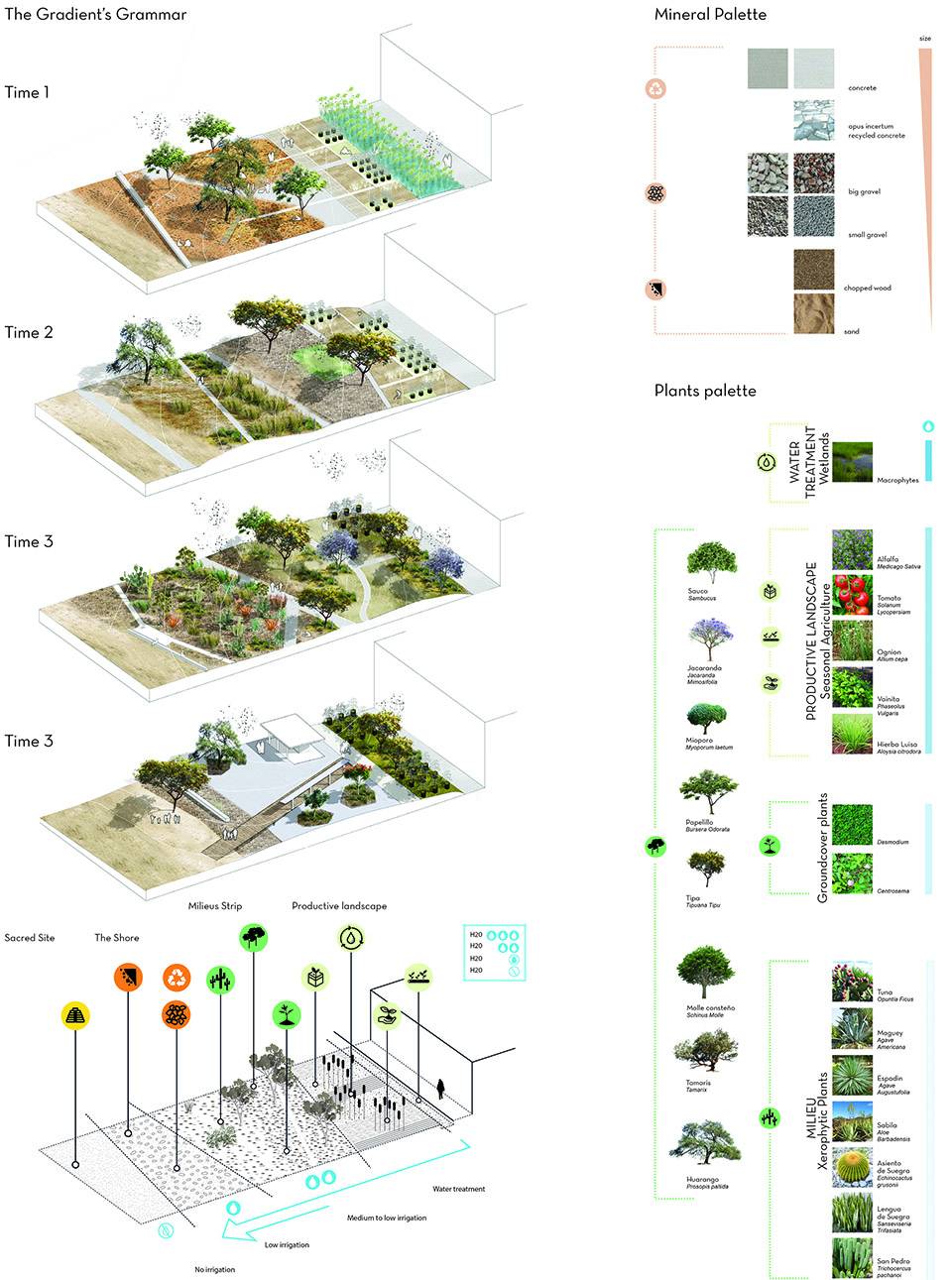 帕查卡馬克公園的神話講述了富饒的海岸線是如何逐步建設而成的,在這里,隨著時間的推移,原有的無效城市資源逐漸轉(zhuǎn)變?yōu)樯鷳B(tài)系統(tǒng)。公園未來的海岸將是一個柔軟且可移動的邊界,它由不同的物質(zhì)組成,平行設置然后相互疊加,當然也可能隨意混合…隨后,這些物質(zhì)再分開;然后不斷地與突然出現(xiàn)的空間阻礙相互適應,再將它們逐漸納入自己的麾下。公園的神話將景觀的產(chǎn)生視為一個集體過程,而新的組合將為公園的共同實施和管理提供可能性。這個過程通過循環(huán)式的變形,對材料物質(zhì)和社會文化資源進行了重新組合。由此,一種新型的、廣闊且富有成效的城市景觀便被創(chuàng)造了出來。與傳統(tǒng)意義上的神話故事一樣,在長期的時間范圍內(nèi),景觀都有能力在一個主要的連貫目標中引導集體能量。