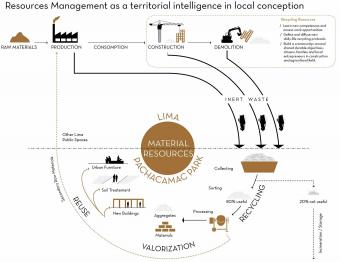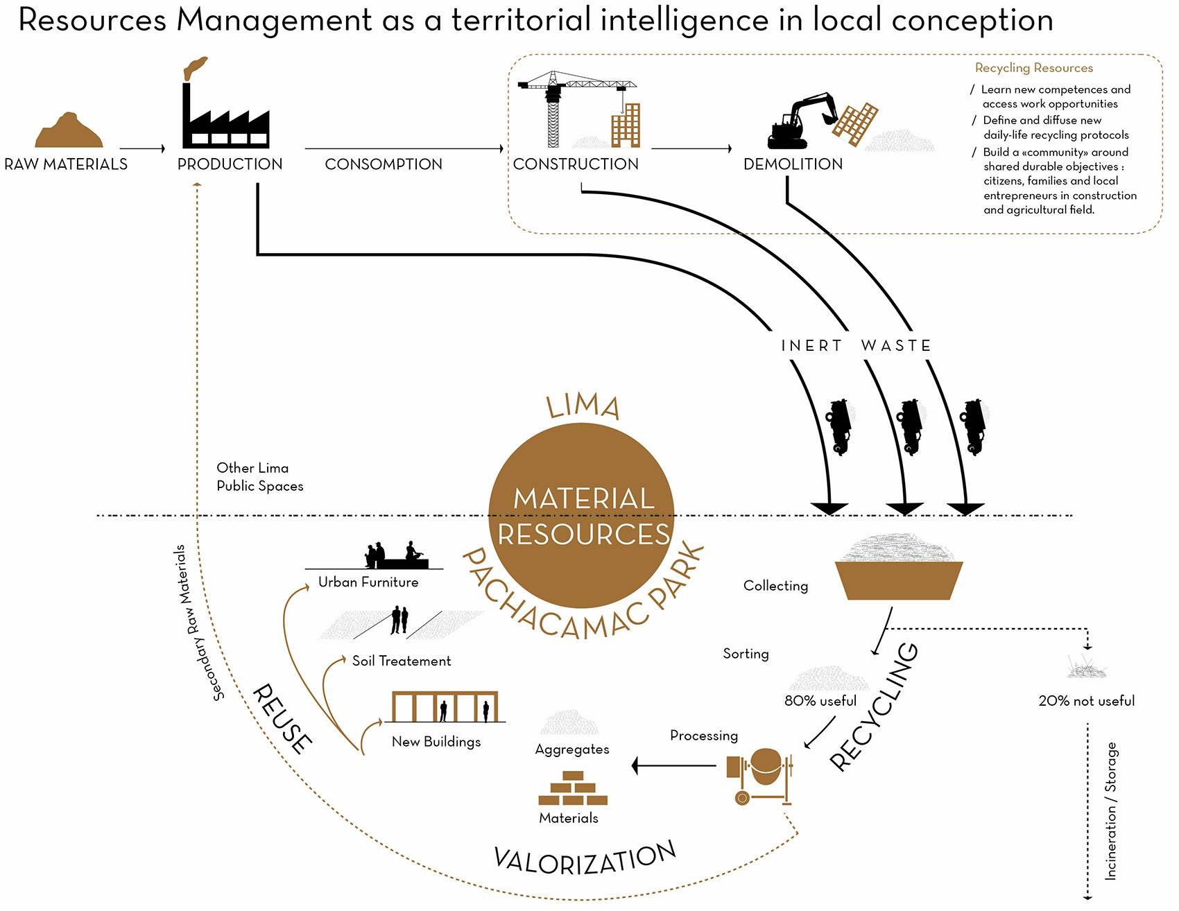如今,建筑業(yè)已經(jīng)消耗了50%的可使用型自然資源,同時產(chǎn)生的廢棄物垃圾也占世界廢棄垃圾總量的50%。自房地產(chǎn)熱潮以來,利馬每年都要產(chǎn)生近300萬噸的建筑和拆遷廢物,而其中70%以上的廢物最終都被遺棄到了非法的荒漠之中,污染了大片的海岸和公共空間。值得人們關注的是,距離公園不遠處,就有一處作為非法荒地的海岸線(從Barlovento海灘到Lurin河口),長度超過8公里。