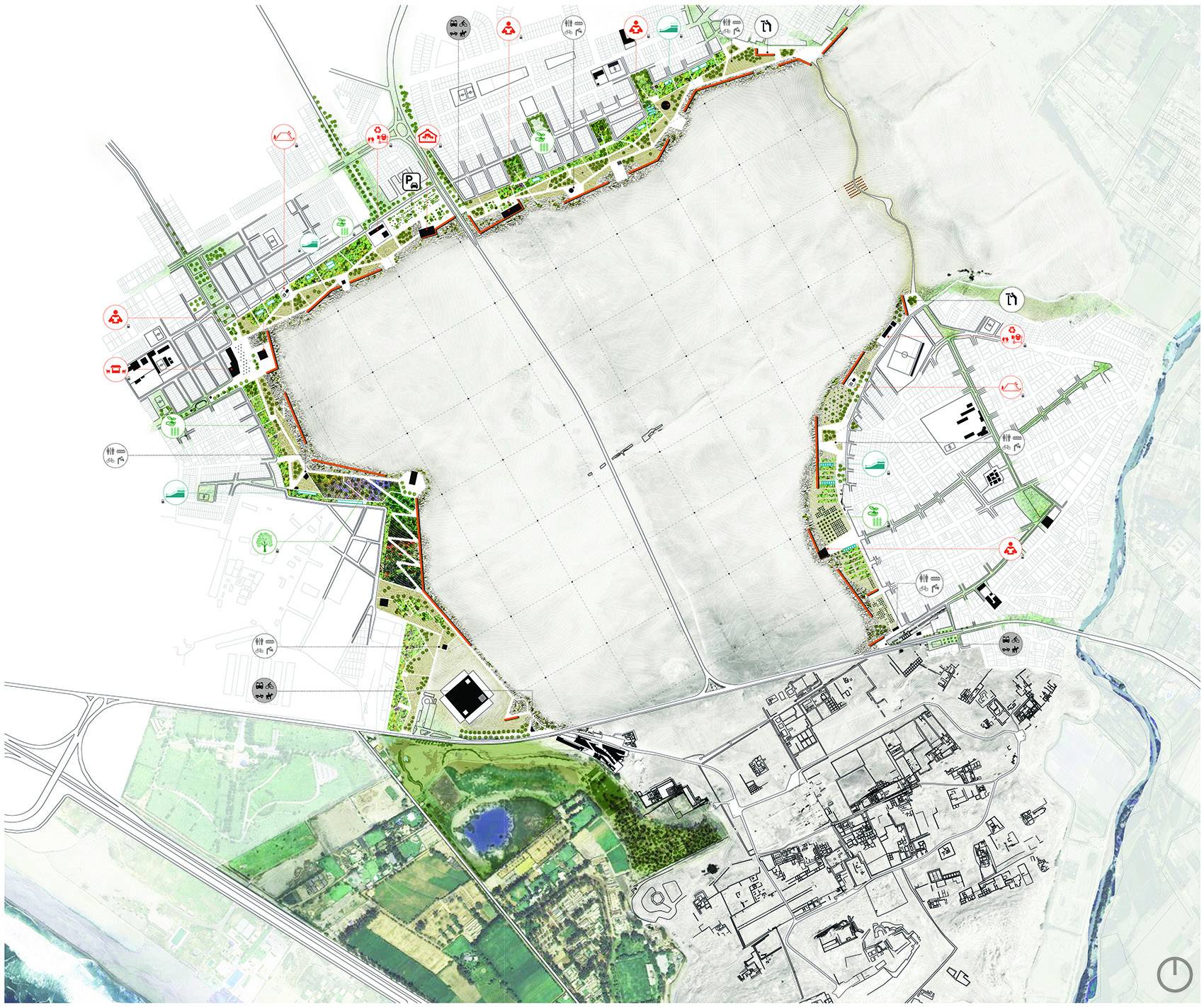 本次競賽的主旨是通過設計,來探討利馬這座城市應該與其歷史遺跡和干旱景觀建立何種關系。該國際競賽提倡以帕查卡馬克的總體規(guī)劃為基礎,而這一總體規(guī)劃,也正是由聯(lián)合國教科文組織(UNESCO)和COPESCO National Plan所發(fā)起的。該總體規(guī)劃要求在帕查卡馬克的歷史遺跡區(qū)的周邊設計一個線性公園。這個未來的線性公園應該為該地區(qū)的一系列新建項目,即國家博物館(National Museum ,MUNA)、Pachacamac遺址博物館(Pachacamac Site Museum)和Urpi Wachaq濕地恢復倡議(Urpi Wachaq initiative for the recovery of wetlands)等,提供更大的凝聚力和連通性。此外,本項目還希望在市郊的非正式擴建區(qū)內(nèi)限定出一個緩沖區(qū)。作為秘魯最重要的遺產(chǎn)區(qū)之一,也作為利馬景觀設計領域中的重要范例,這座規(guī)模宏大的公園將進一步鞏固和加強帕查卡馬克保護區(qū)(Pachacamac Sanctuary)。因此,本次競賽鼓勵所有的參賽隊伍在設計中考慮場地的文化及其生態(tài)環(huán)境和社會環(huán)境的復雜性,從而實現(xiàn)一次前所未有的大融合。