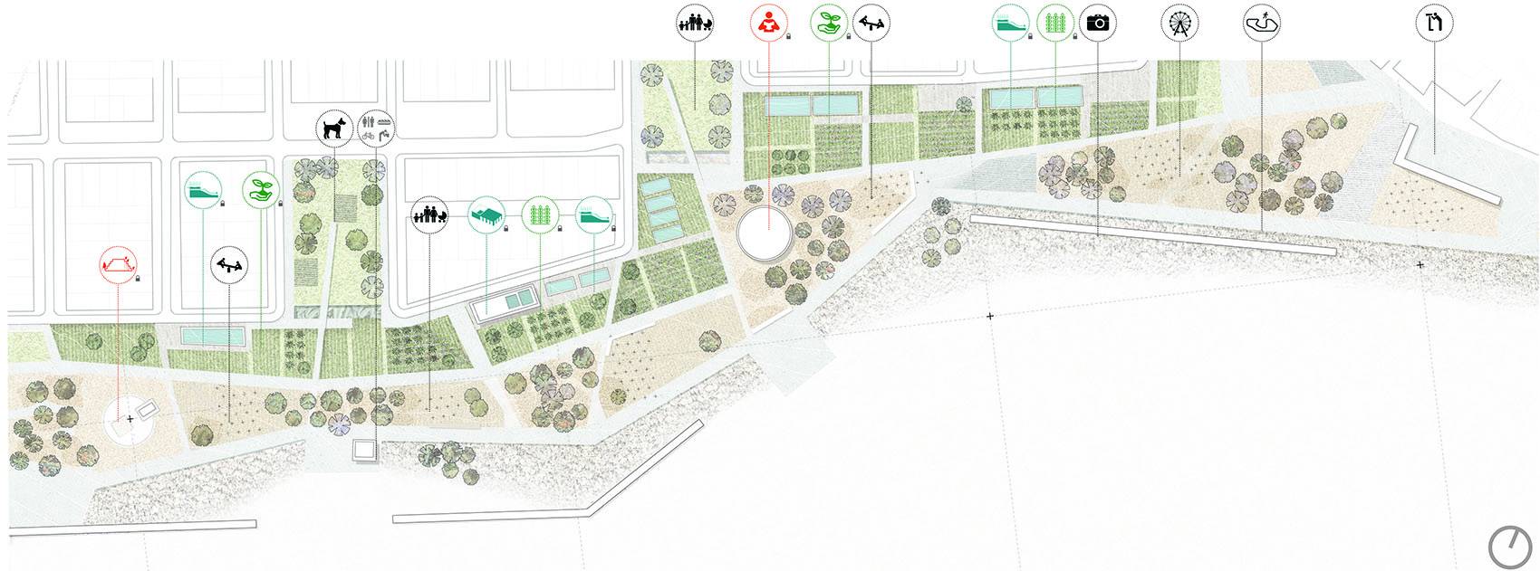 1. “生產(chǎn)景觀”從第一階段起便沿著現(xiàn)有的城市結(jié)構(gòu)建立,不僅促進了城市服務,更為未來公園的構(gòu)建提供了前提條件。這一部分的景觀包括:水景園區(qū)、植物園區(qū)和城市農(nóng)業(yè)地帶等。