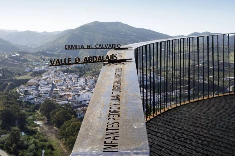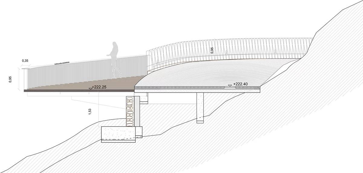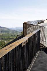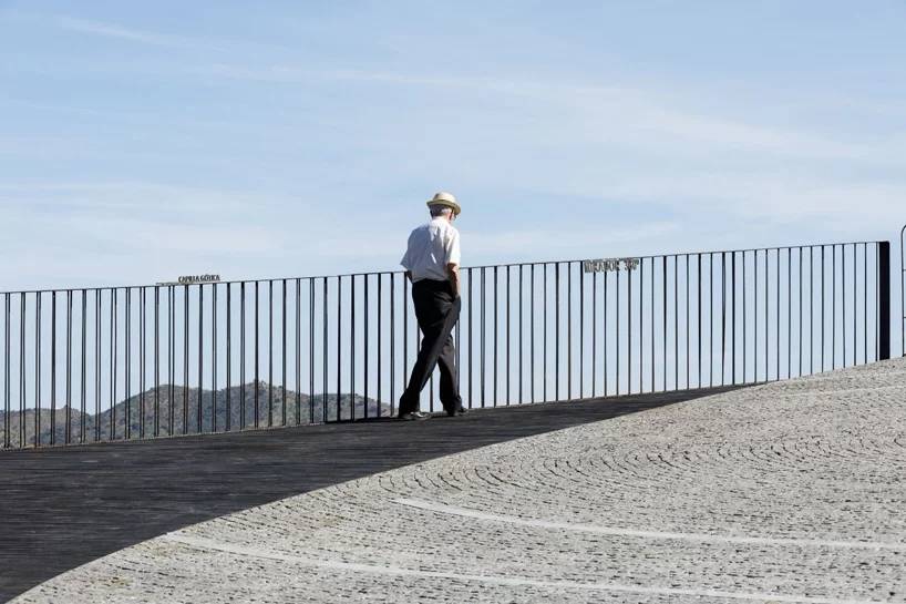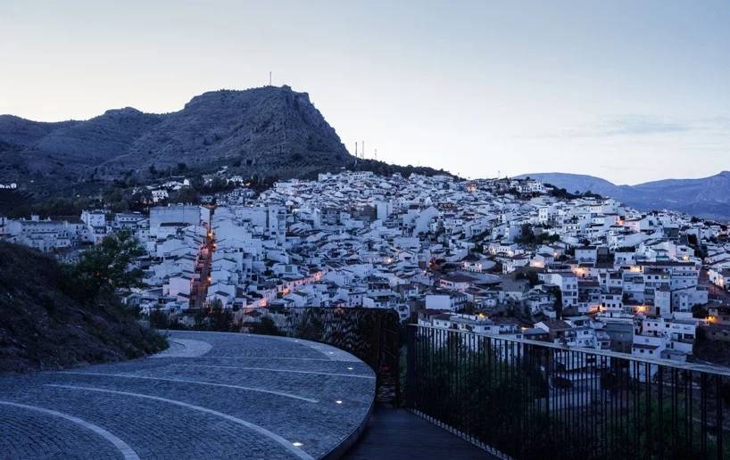 “360°展望臺”連接了álora古村內(nèi)主廣場和山上的城堡。原先通往古城堡的路已經(jīng)荒廢許久無法繼續(xù)使用,所以設(shè)計方用砂巖做了擋土墻。砂巖顏色和材質(zhì)跟這座山丘融為一體,從視覺上來看沒有任何"異質(zhì)感"。另外,用小石子鋪成的“石子地毯”繪顯示不同的紋理。展望臺上的不同角度的視角,可以觀看到不同的景象?;蚋╊靼嘌滥喜课词芷茐牡淖匀伙L(fēng)景,或欣賞到álora村莊古老的建筑,包括哥特式的耶穌教堂、阿拉伯城堡、中世紀建筑群,或者村莊周邊邊界。