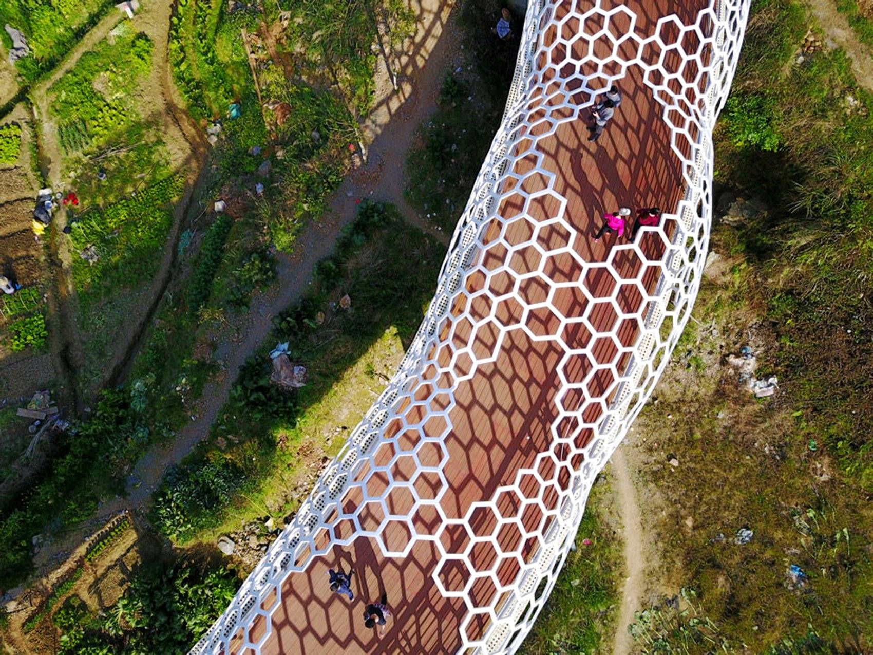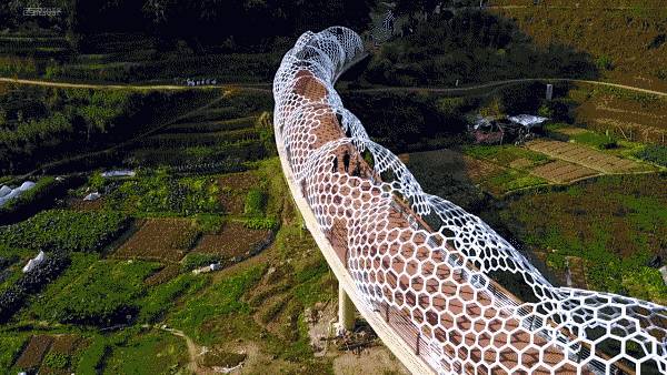 橫跨鳳凰谷80米長的“板凳龍橋”,設(shè)計將大田國家級非物質(zhì)文化遺產(chǎn)“大田板凳龍”的形態(tài)進行抽象