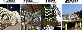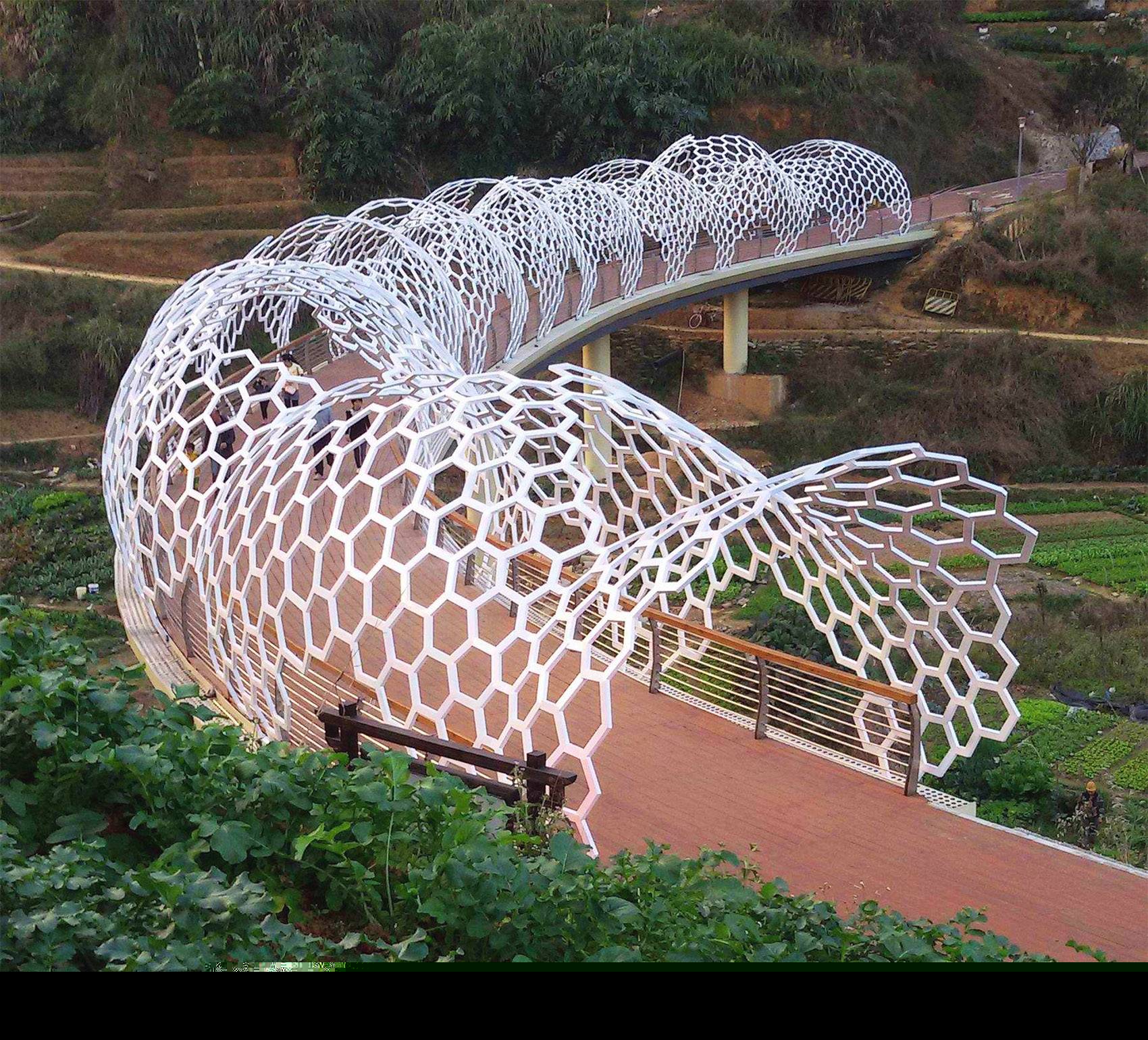 設(shè)計提煉: 5根圓橋墩抽象成“連接把手”,主梁體抽象成“板凳”,橋上的異型雙曲面鋼結(jié)構(gòu)網(wǎng)架抽象成“龍身”,菱形的網(wǎng)架肌理象征板凳龍的竹編表皮,網(wǎng)架端部與綠葉融合抽象成龍尾與龍首,通透的網(wǎng)架表皮“似有非有”傳達了“龍現(xiàn)無形”的意境。設(shè)計摒棄傳統(tǒng)具象的龍的形態(tài)設(shè)計,而是將大田板凳龍的形象抽象并提煉升華,用現(xiàn)代的鋼材料和城市雕塑手法,對大田鄉(xiāng)土建筑進行探索表達。