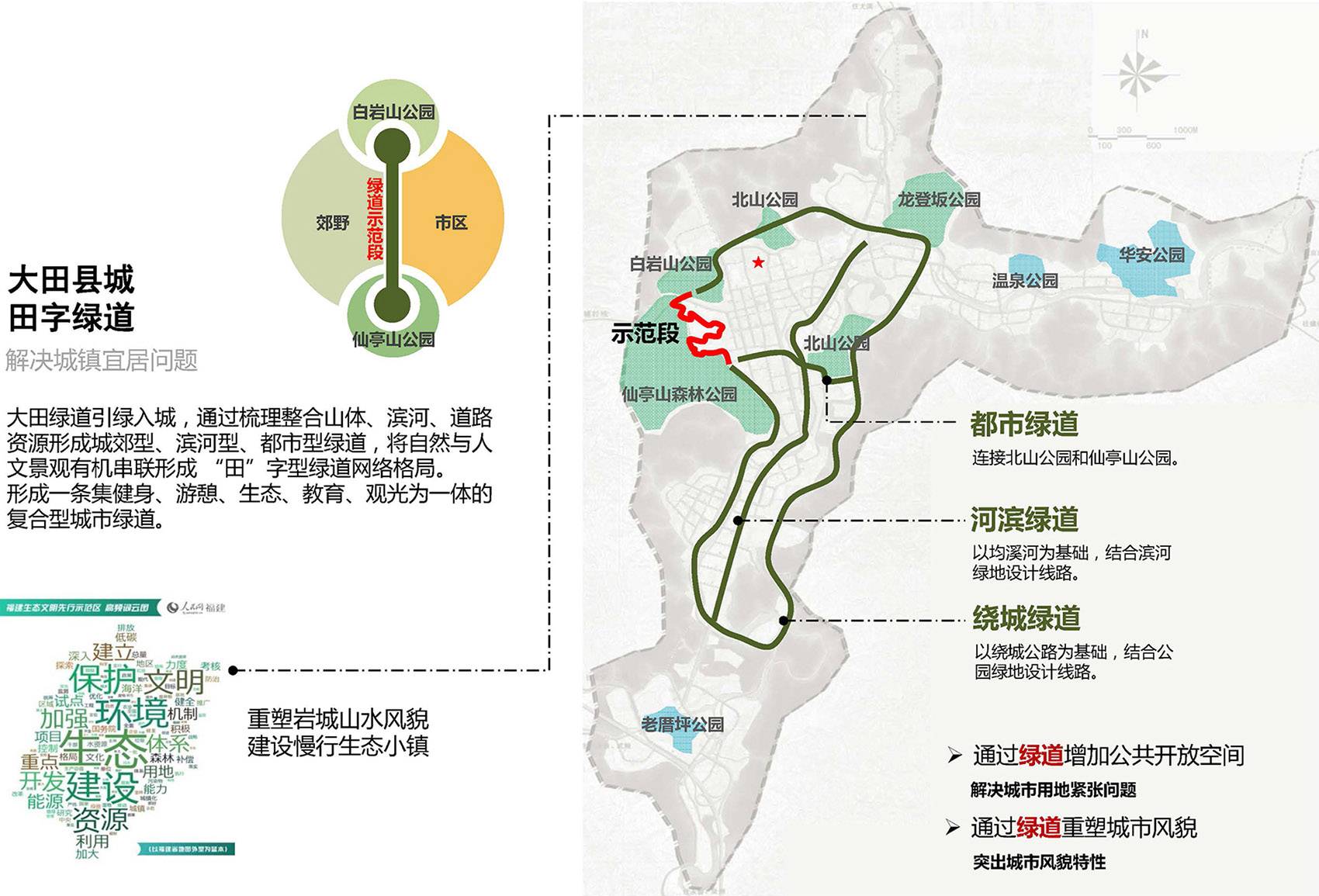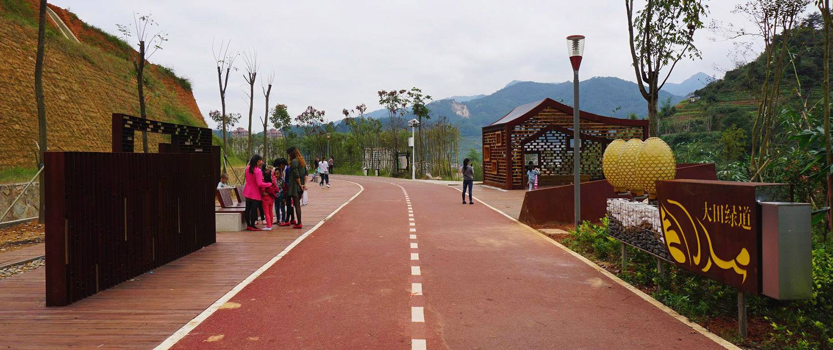 大田綠道引綠入城,通過梳理整合山體、濱河、道路資源形成城郊型、濱河區(qū)、都市型綠道,將自然與人文的景觀有機串聯(lián)形成“田”字型綠道網(wǎng)絡(luò)格局。為城鎮(zhèn)及周邊居民提供生態(tài)、健康的宜居環(huán)境,重塑了大田山水城鎮(zhèn)的風(fēng)貌。