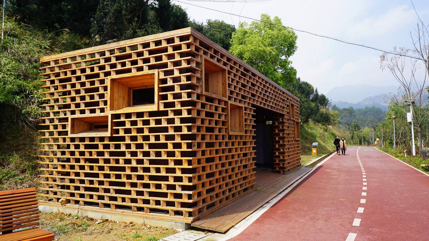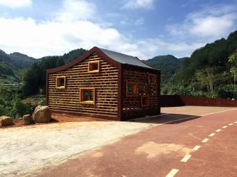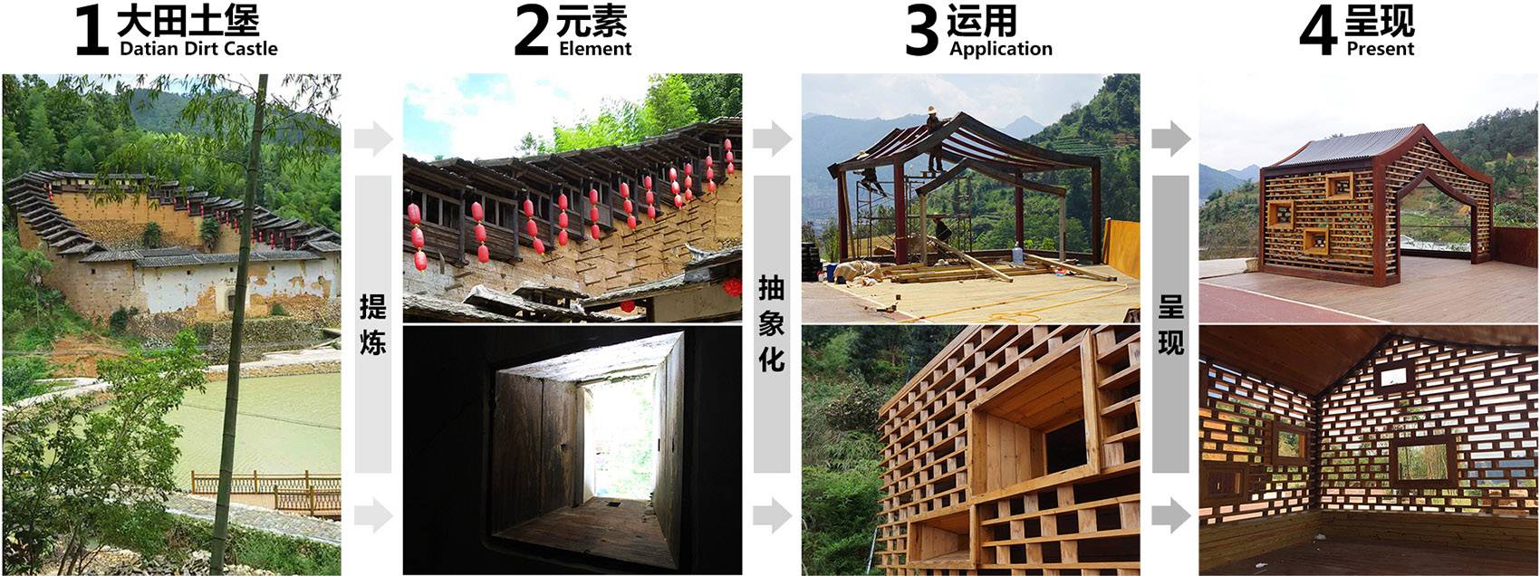 設(shè)計抽象提煉了大田國家級歷史文化保護建筑“土堡”來進行鄉(xiāng)土文化傳承,用“虛實相間”的木網(wǎng)格象征土堡的土墻、 “米斗狀”的木窗象征土堡的瞭望窗,鋼管形成土堡的屋檐。會隨時間變化的紅色銹鋼來象征大田特有的“紅壤”并融入周邊環(huán)境。