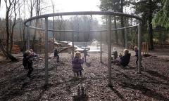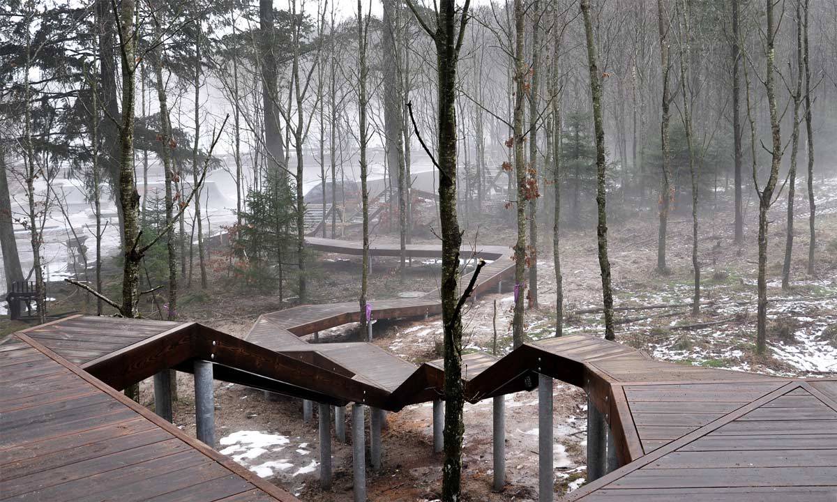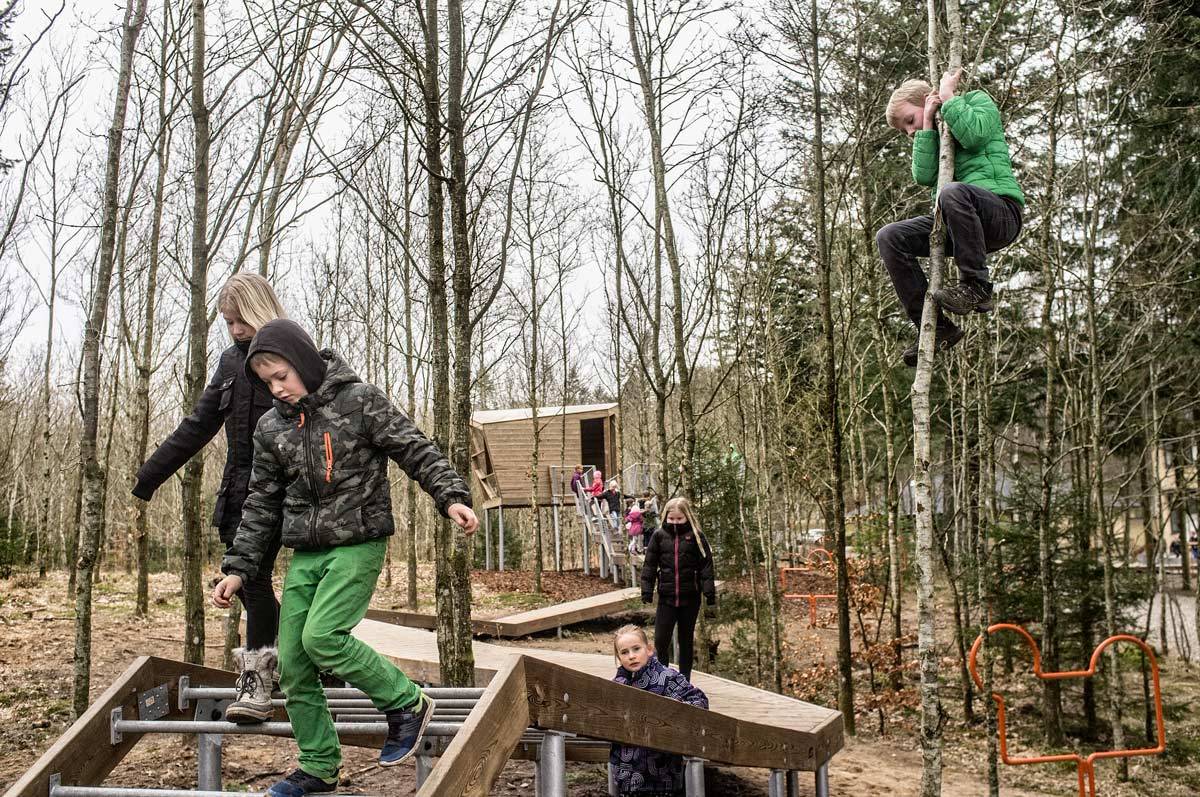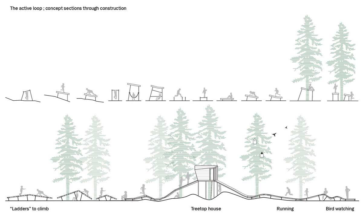 設(shè)計團(tuán)隊(duì)在學(xué)校和森林設(shè)計制作了多種游樂設(shè)施,連接了學(xué)校和森林兩個場地,豐富了活動空間及游樂方式。希望以此,吸引過渡依戀和使用電視、電腦的青少年,增加他們的戶外活動頻率。